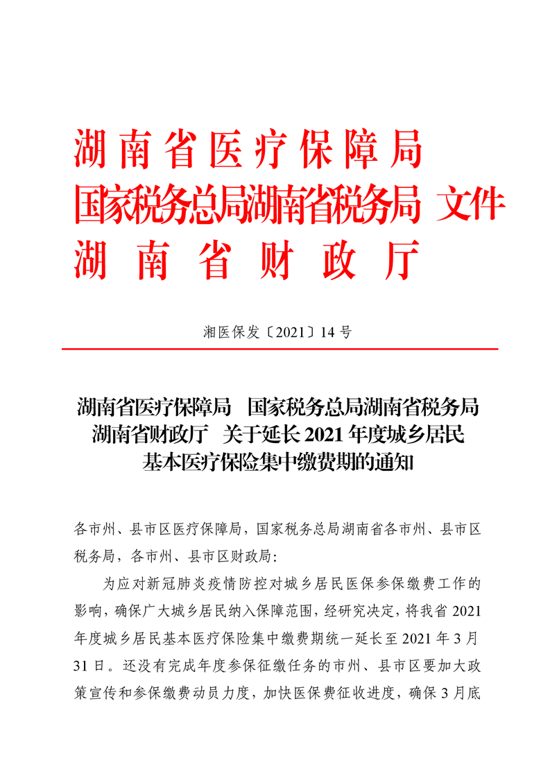 关于延长2021年度城乡居民医保基本医疗保险集中缴费期的通知 (湘医保发〔2021〕14号)