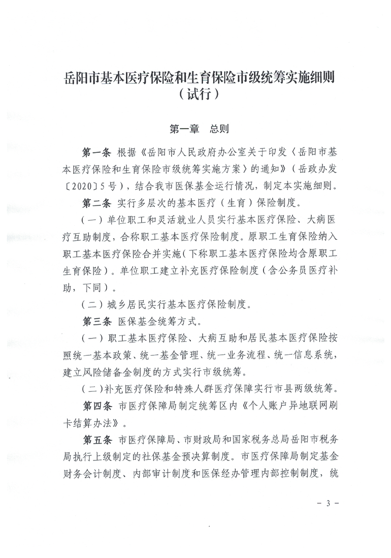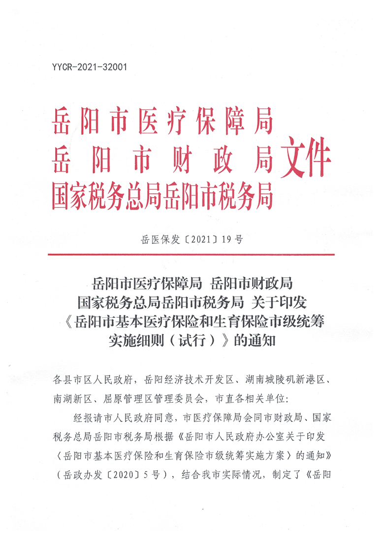 关于印发《岳阳市基本医疗保险和生育保险市级统筹实施细则(试行)》的通知