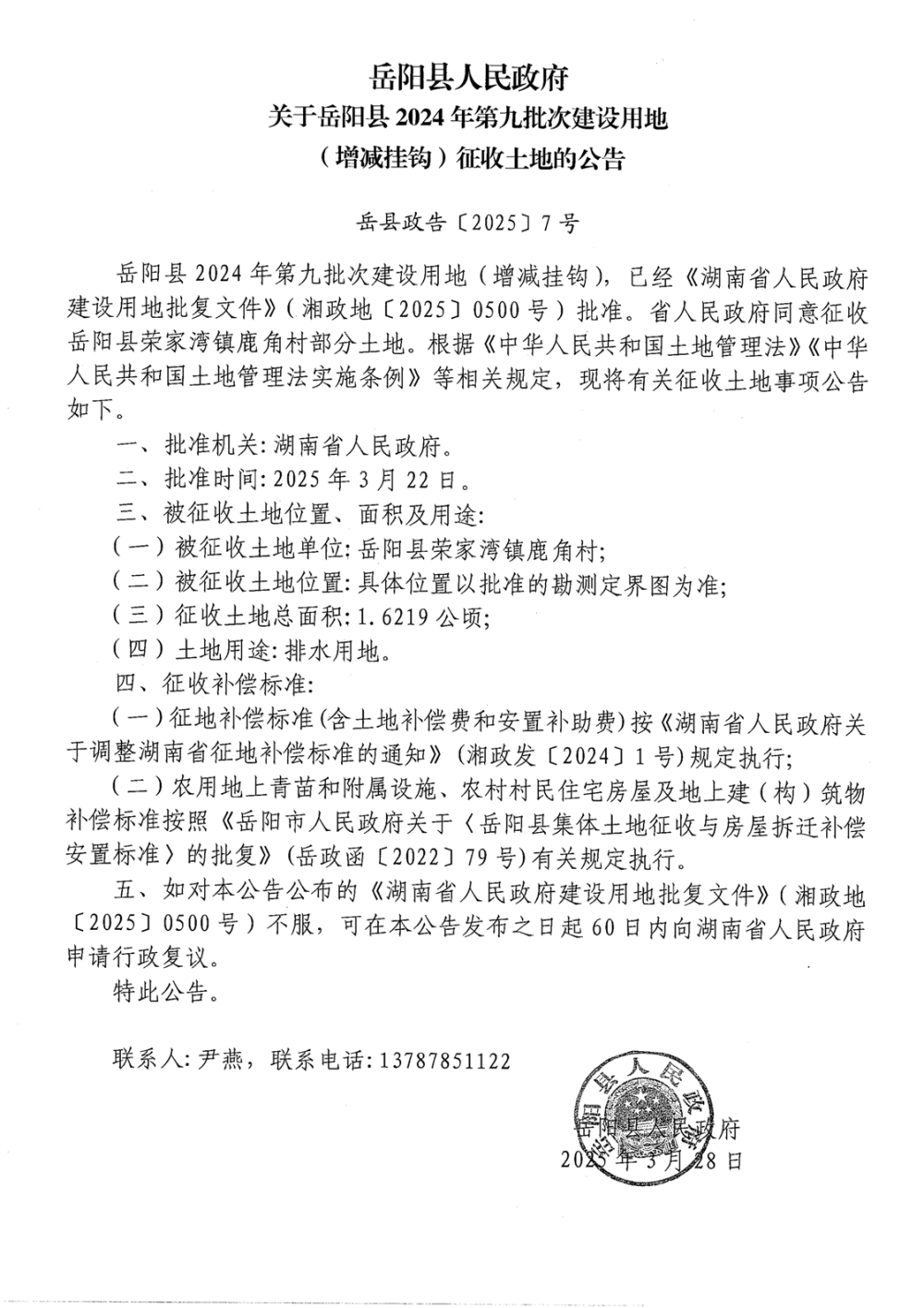 岳阳县人民政府 关于岳阳县2024年第九批次建设用地 (增减挂钩)征收土地的公告