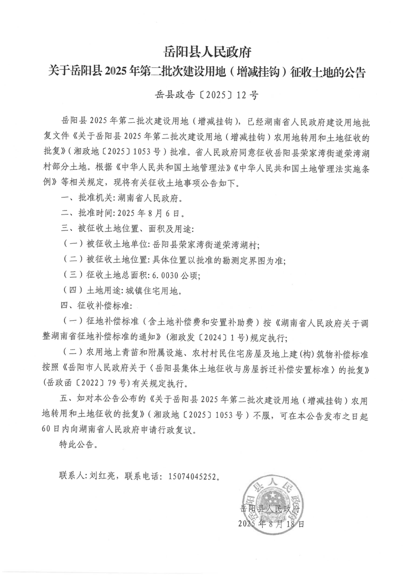 岳阳县人民政府关于岳阳县2025年第二批次建设用地(增减挂钩)征收土地的公告