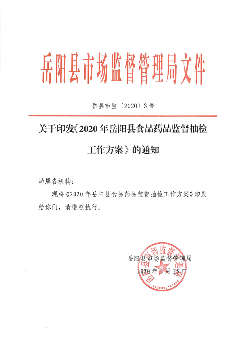 关于印发《2020年岳阳县食品药品监督抽检工作方案》的通知