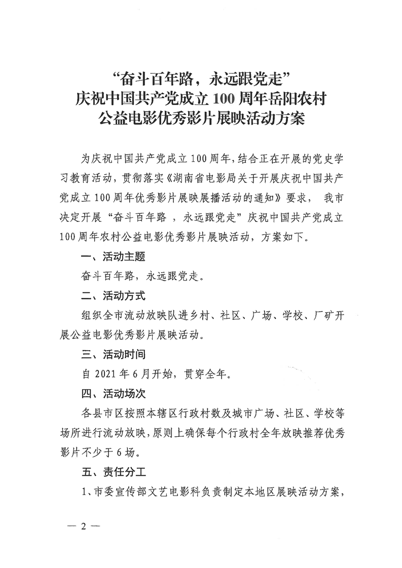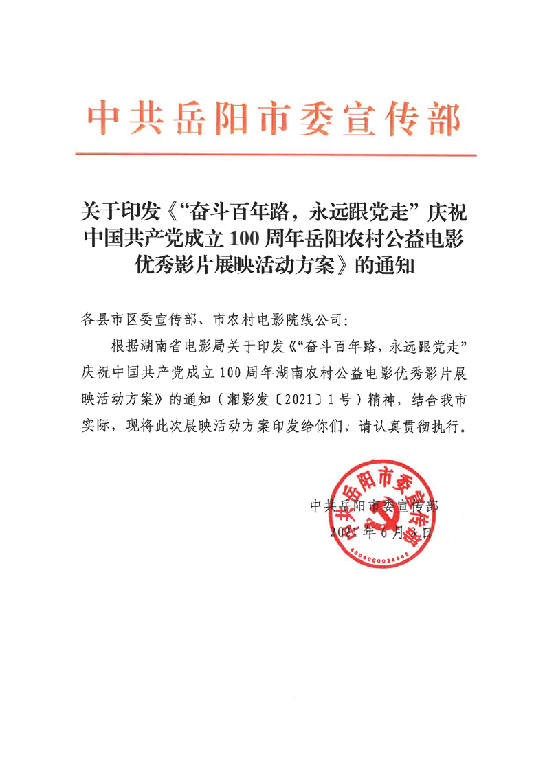 关于印发《“奋斗百年路,永远跟党走”庆祝中国共产党成立100周年岳阳农村公益电影优秀影片展映活动方案》的通知