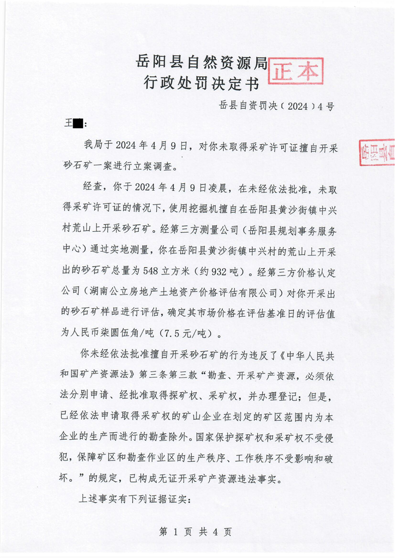 行政处罚决定书 岳县自然资罚决〔2024〕第4号