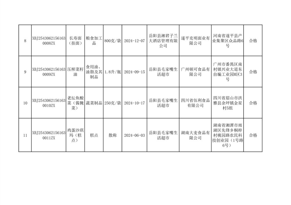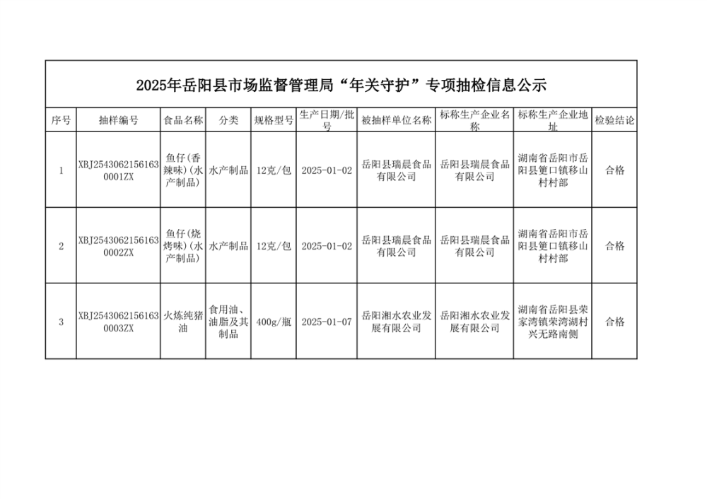 2025年岳阳县市场监督管理局“年关守护”专项抽检信息公示