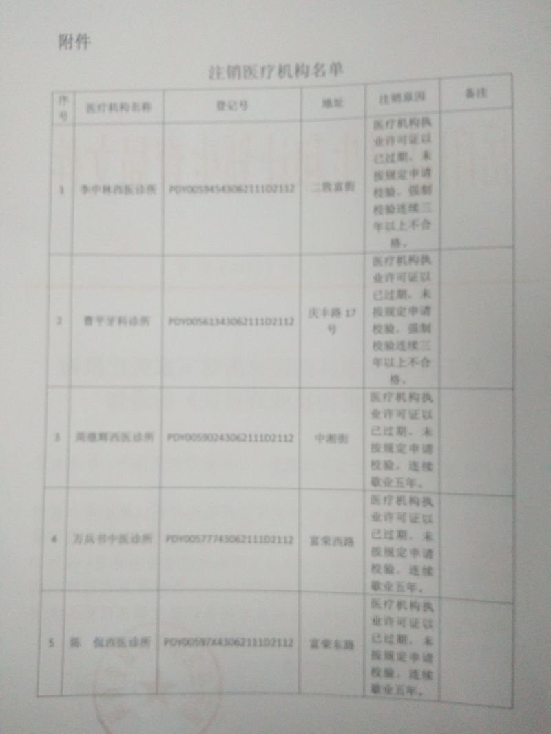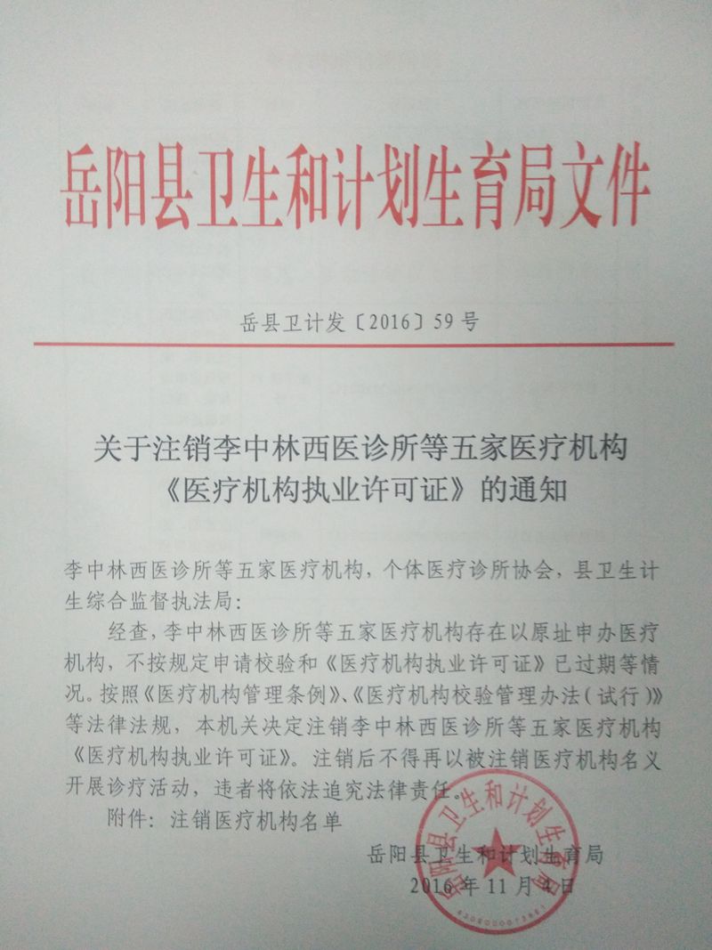 关于注销李中林西医诊所等五家医疗机构 《医疗机构执业许可证》的通知
