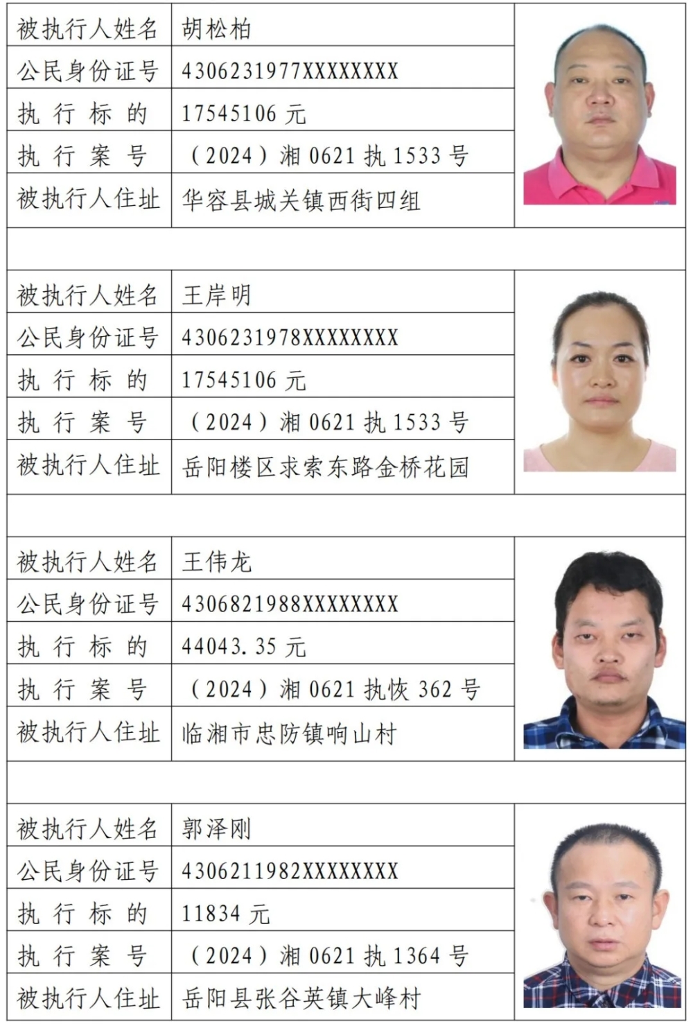 为敦促被执行人自觉履行生效法律文书确定的义务,努力推进社会诚信建设。根据《中华人民共和国民事诉讼法》《最高人民法院关于公布失信被执行人名单信息的若干规定》等相关法律和规定,本院决定对下列失信被执行人信息予以曝光。曝光人员应立即履行生效法律文书确定的义务,否则将视情节采取罚款、拘留等强制措施,对拒不履行、抗拒执行、规避执行的被执行人将依法追究刑事责任。【备注:下述失信被执行人名单信息仅代表本次曝光时段情况,实时失信被执行人信息以最高院网站查询结果为准。欢迎广大人民群众对已曝光被执行人行踪及财产线索进行举报。举报电话:0730-7668833。】