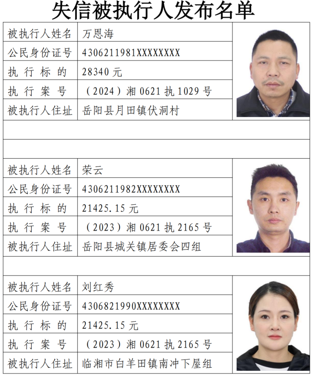 岳阳县失信被执行人名单(2025年第1期)