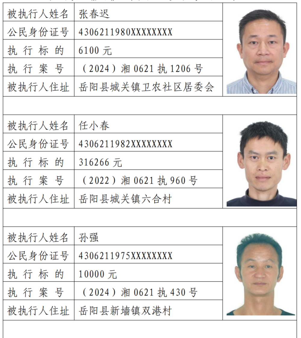 为敦促被执行人自觉履行生效法律文书确定的义务,努力推进社会诚信建设。根据《中华人民共和国民事诉讼法》《最高人民法院关于公布失信被执行人名单信息的若干规定》等相关法律和规定,本院决定对下列失信被执行人信息予以曝光。曝光人员应立即履行生效法律文书确定的义务,否则将视情节采取罚款、拘留等强制措施,对拒不履行、抗拒执行、规避执行的被执行人将依法追究刑事责任。【备注:下述失信被执行人名单信息仅代表本次曝光时段情况,实时失信被执行人信息以最高院网站查询结果为准。欢迎广大人民群众对已曝光被执行人行踪及财产线索进行举报。举报电话:0730-7668833。】