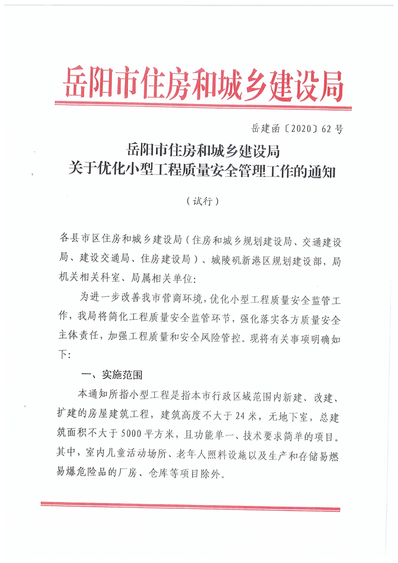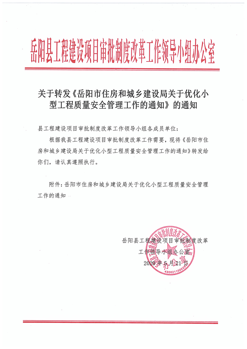 关于转发《岳阳市住房和城乡建设局关于优化小型工程质量安全管理工作的通知》的通知
