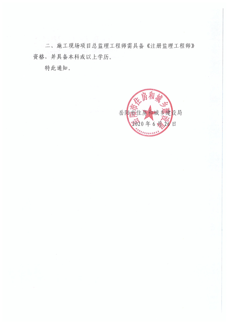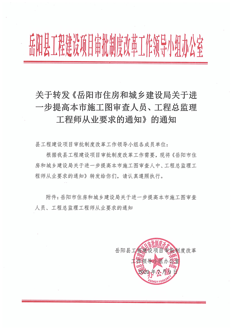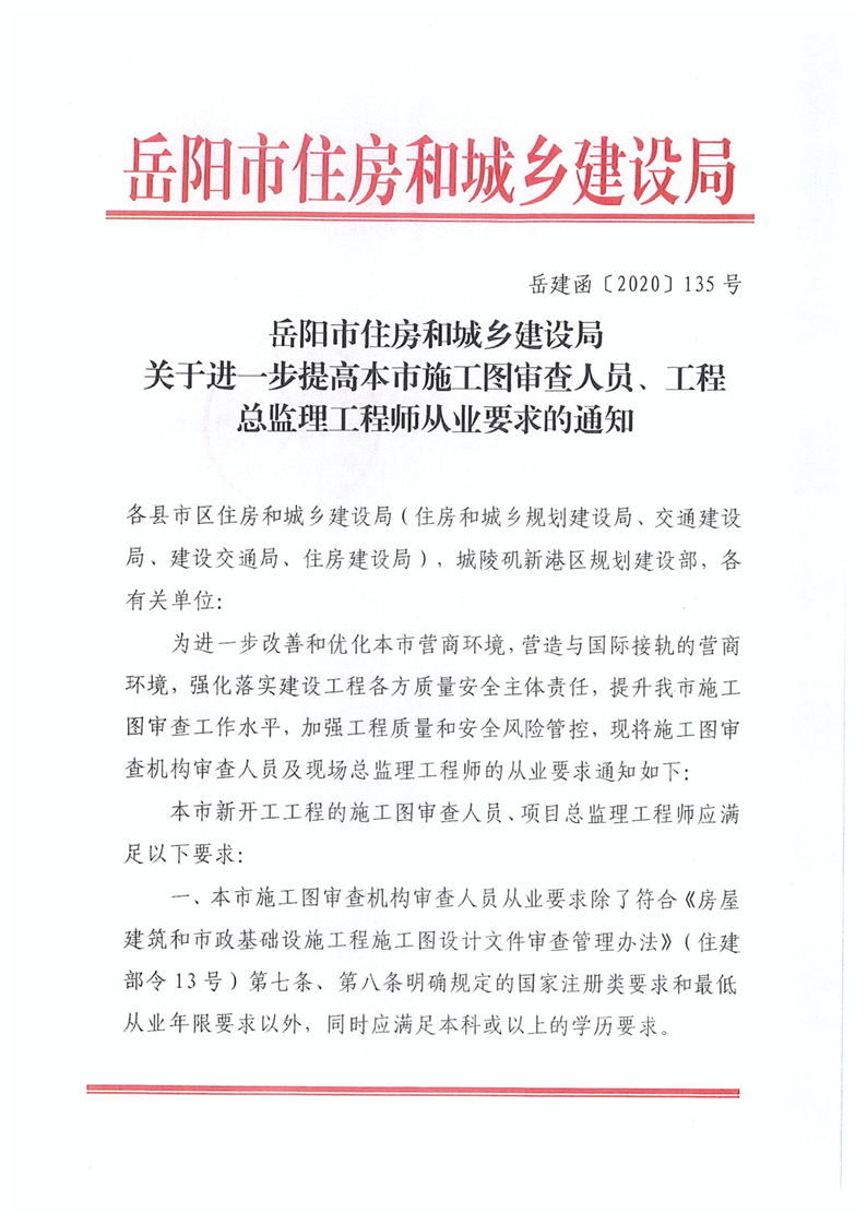 关于转发《岳阳市住房和城乡建设局关于进一步提高本市施工图审查人员、工程总监理工程师从业要求的通知》的通知