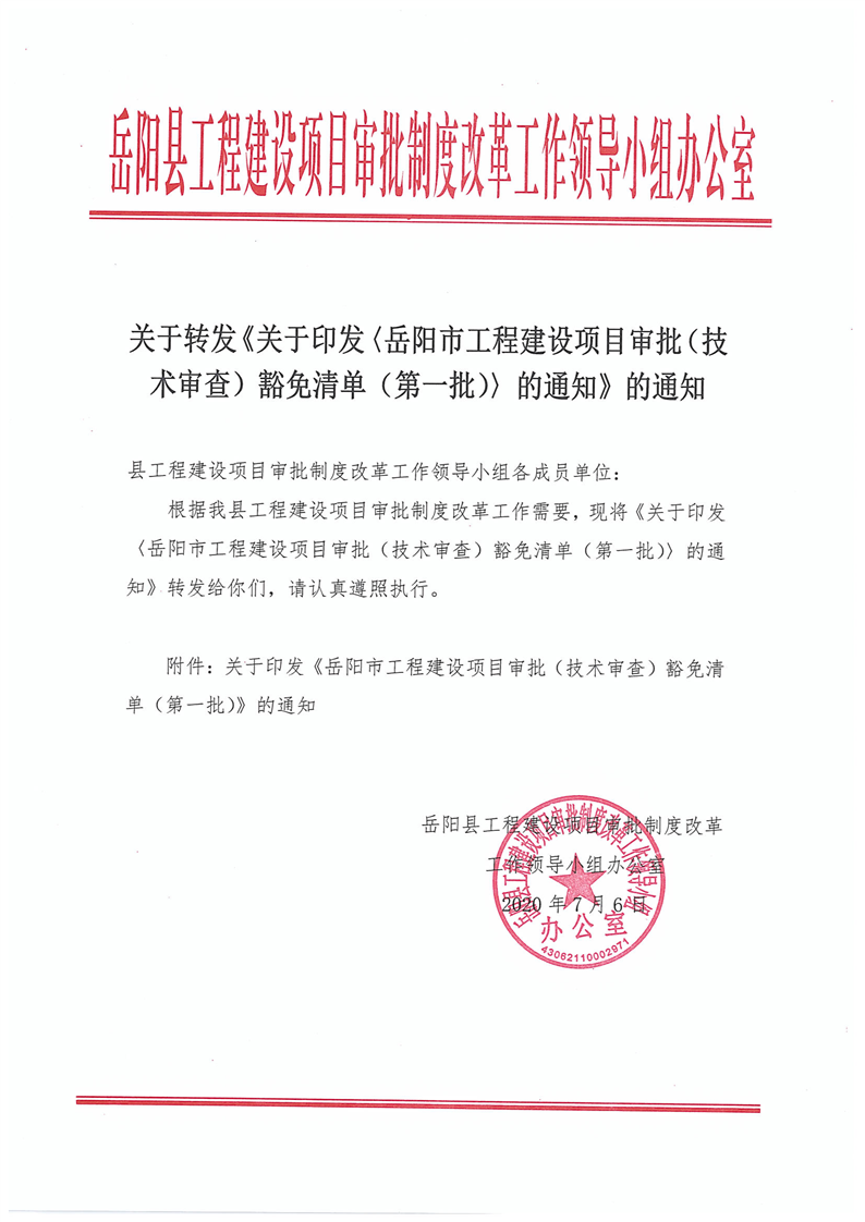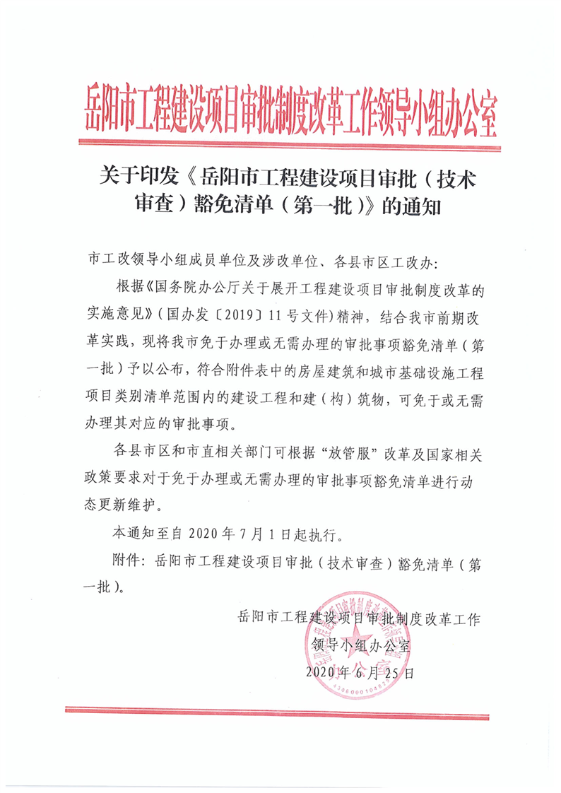 关于转发《关于印发 岳阳市工程建设项目审批(技术审查)豁免清单(第一批)的通知》