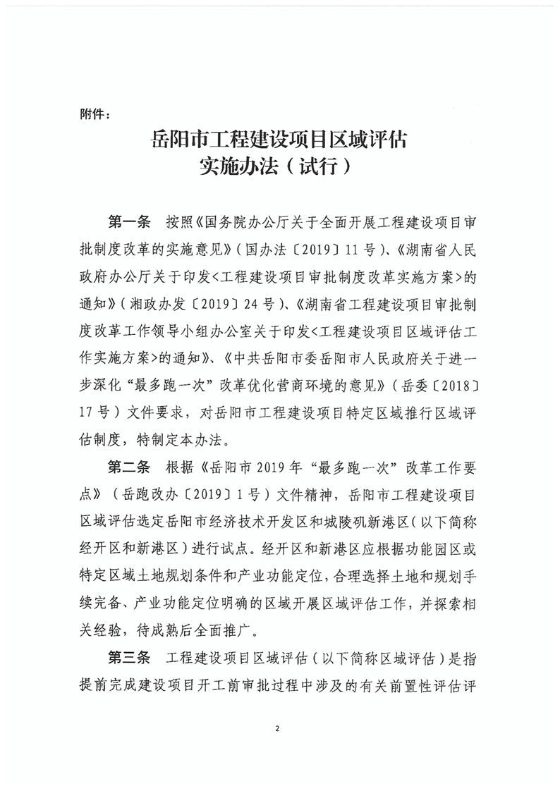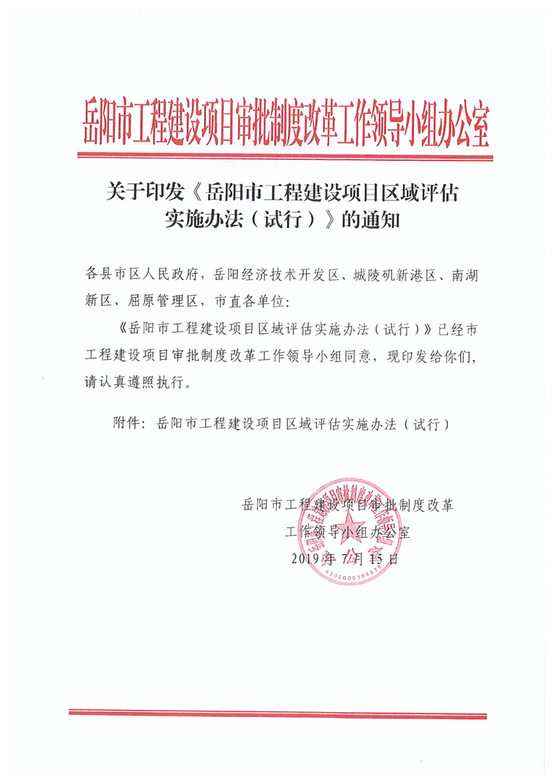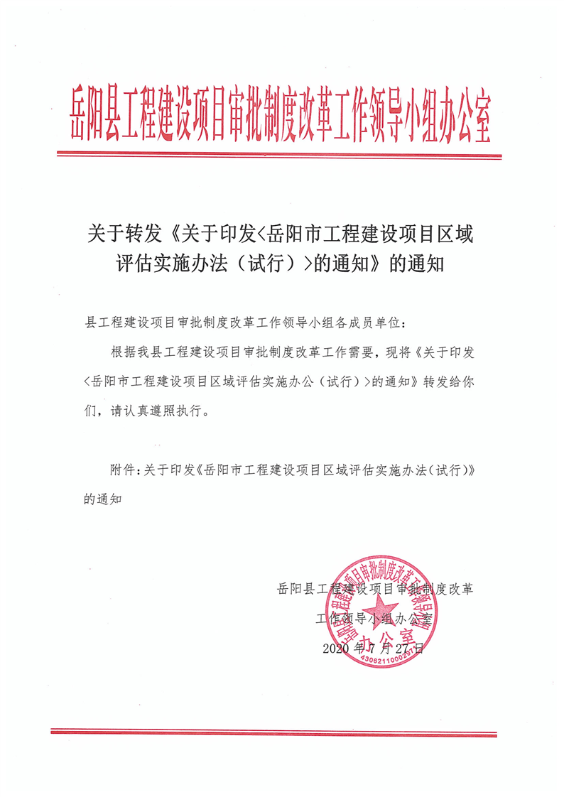 关于转发《关于印发 岳阳市工程建设项目区域评估实施办法(试行)的通知》
