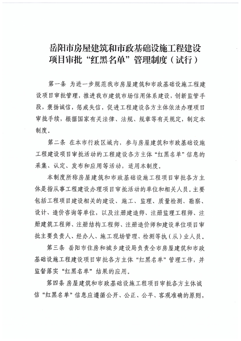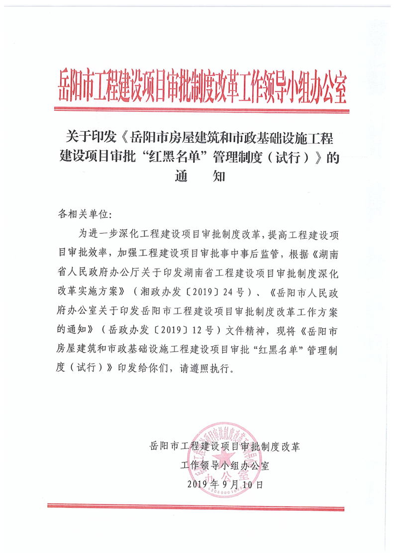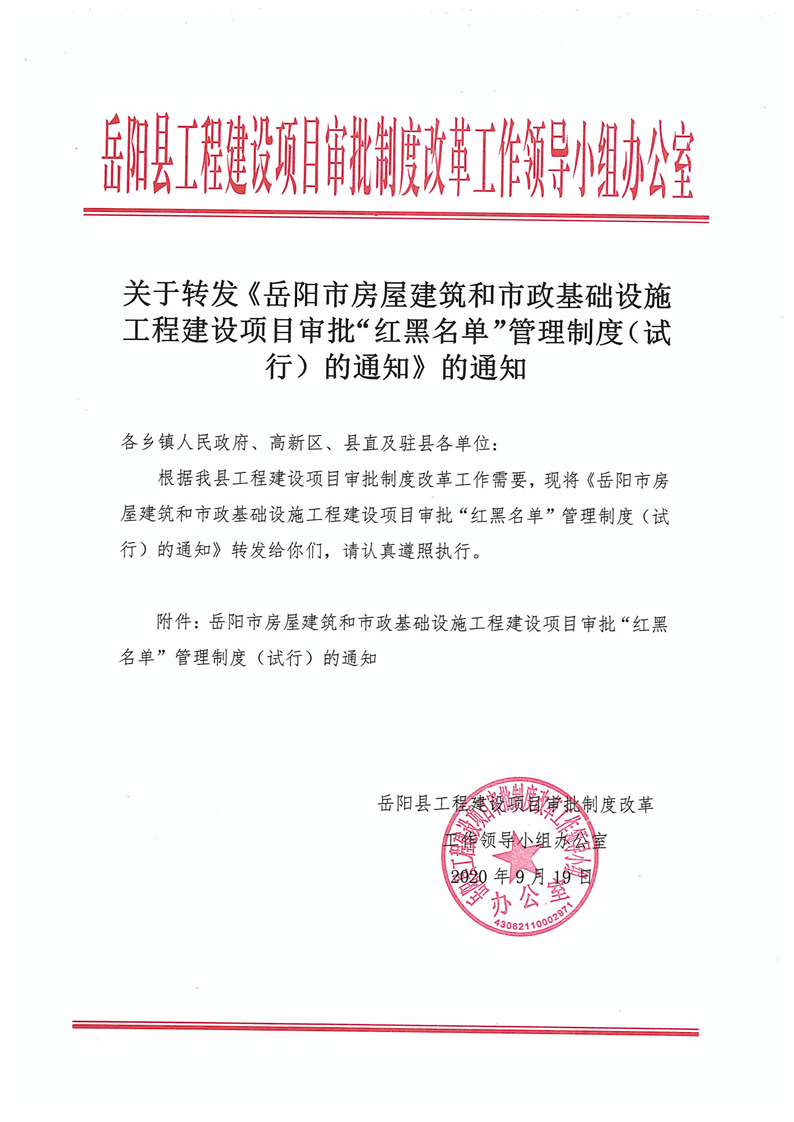 关于转发《岳阳市房屋建筑和市政基础设施工程建设项目审批”红黑名单“管理制度(试行)的通知》