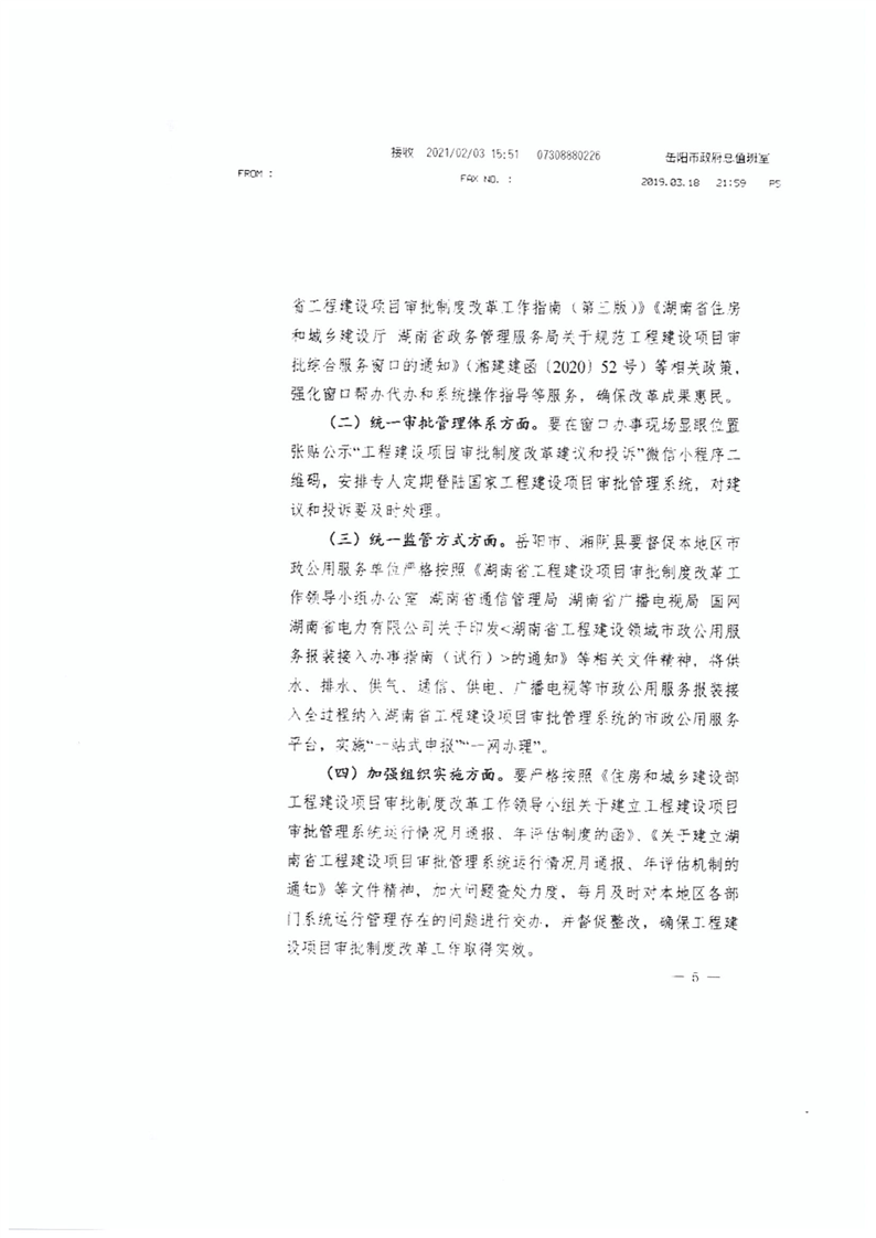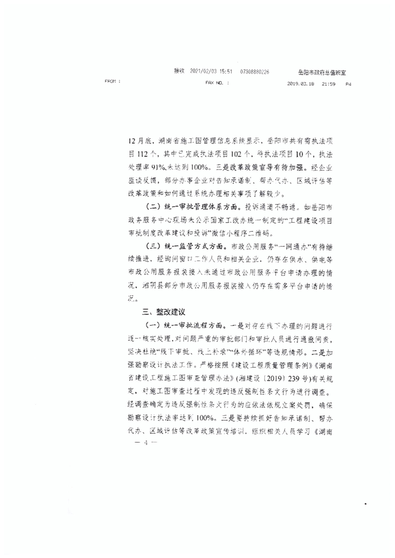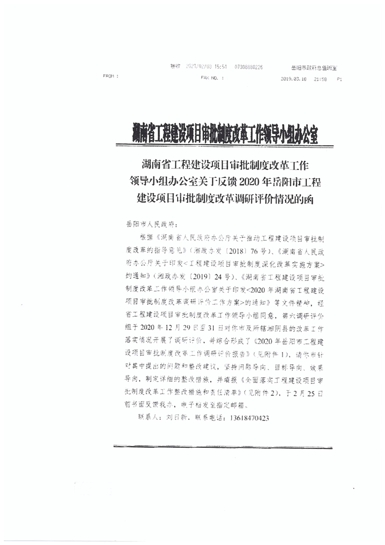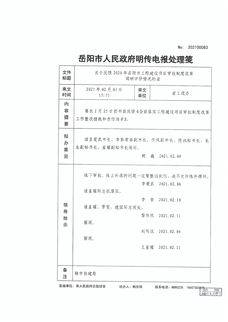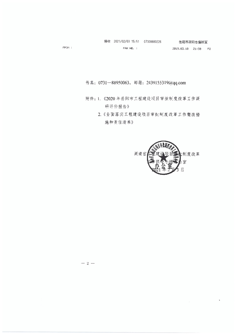 湖南省工程建设项目审批制度改革工作领导小组办公室关于反馈2020年岳阳市工程建设项目审批制度改革调研情况的函