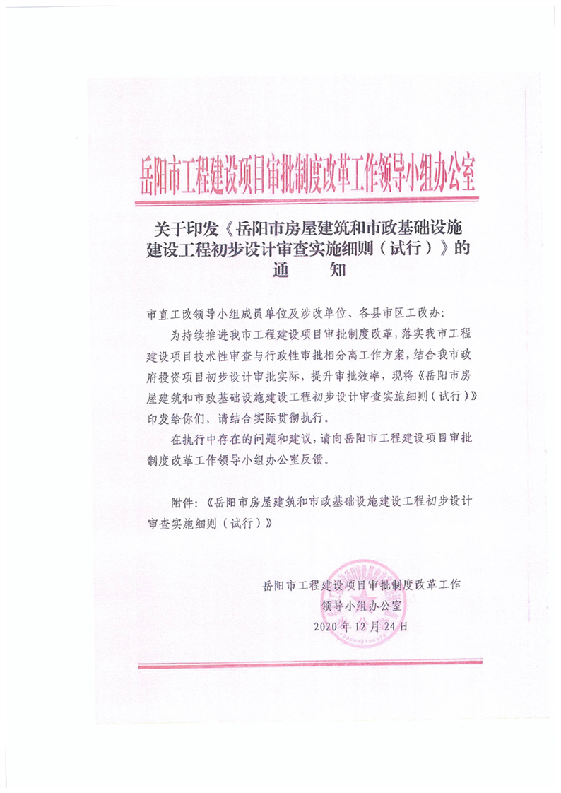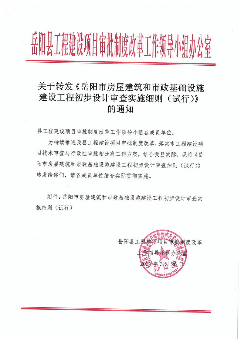 关于转发《岳阳市房屋建筑和市政基础设施建设工程初步设计审查实施细则(试行)》的通知