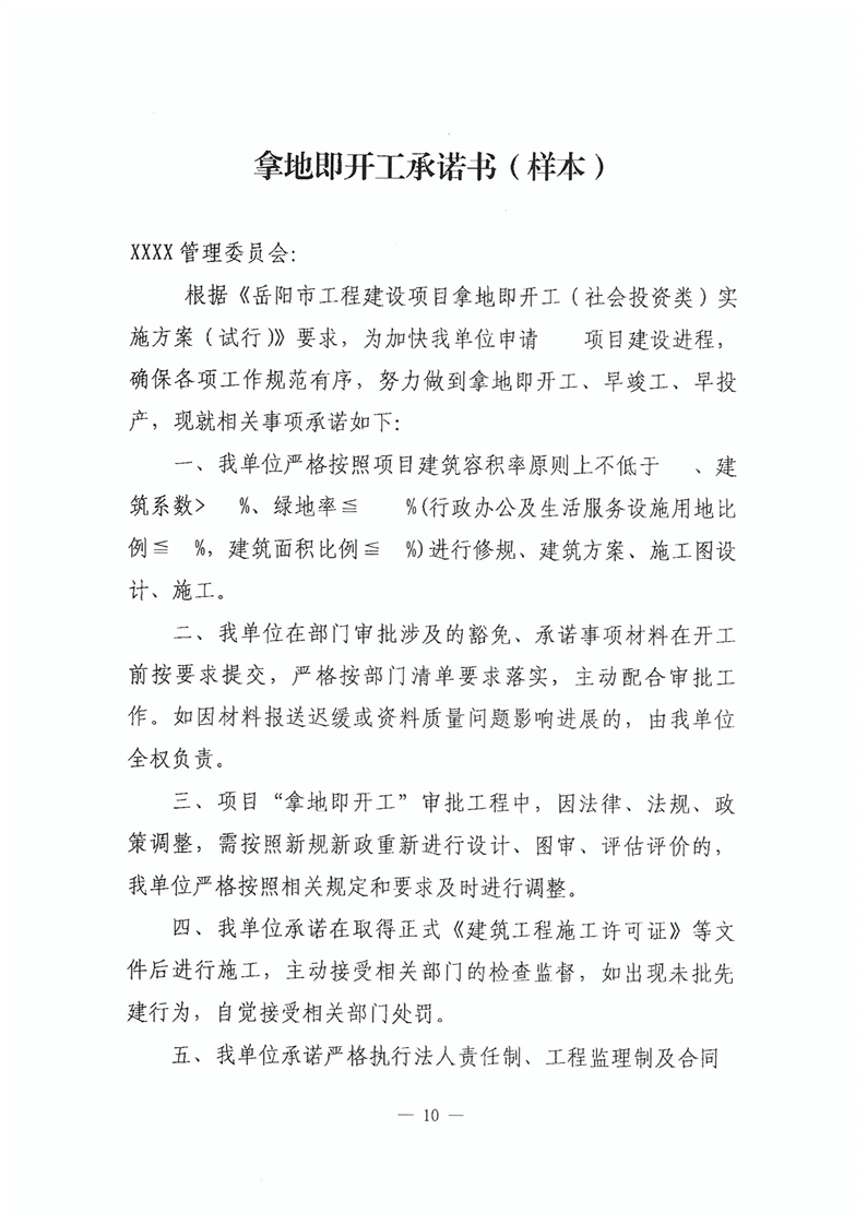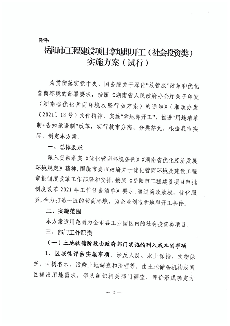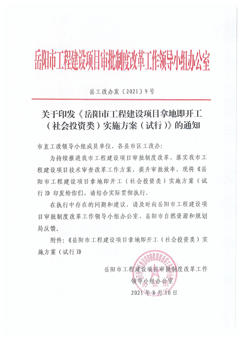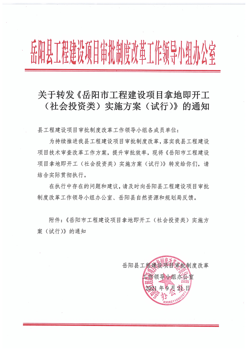 关于转发《岳阳市工程建设项目拿地即开工(社会投资类)实施方案(试行)》的通知