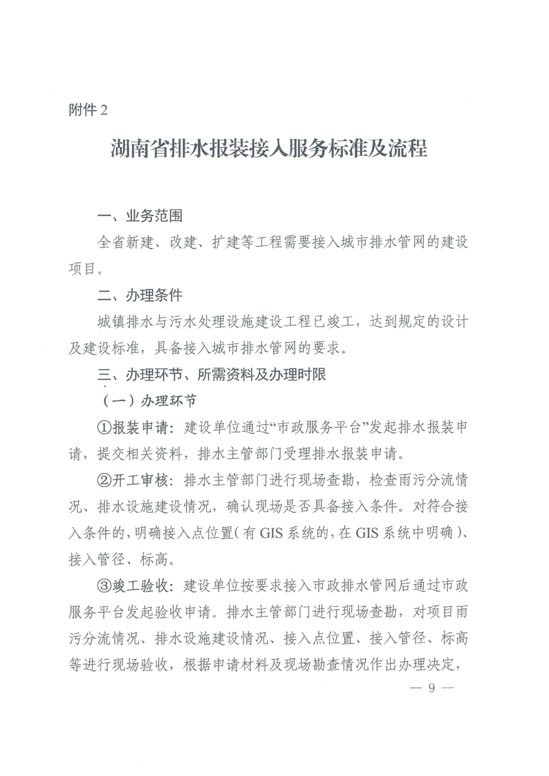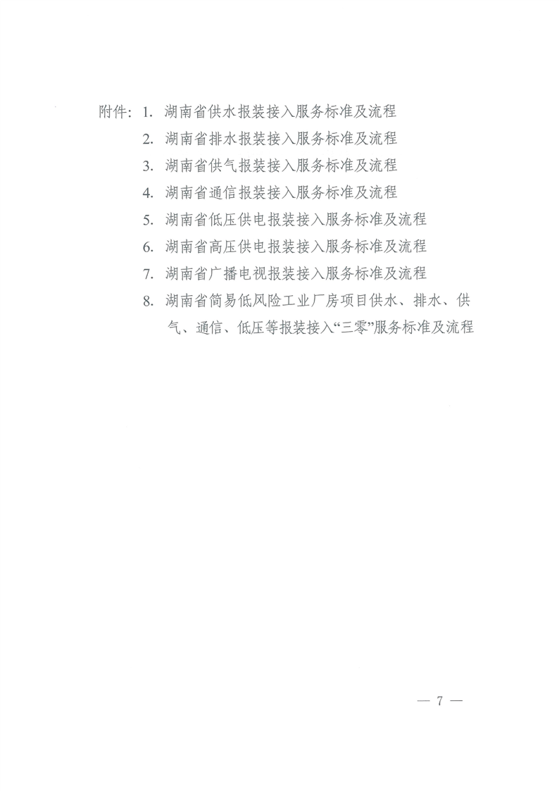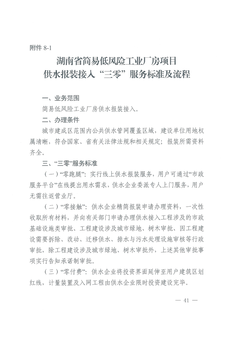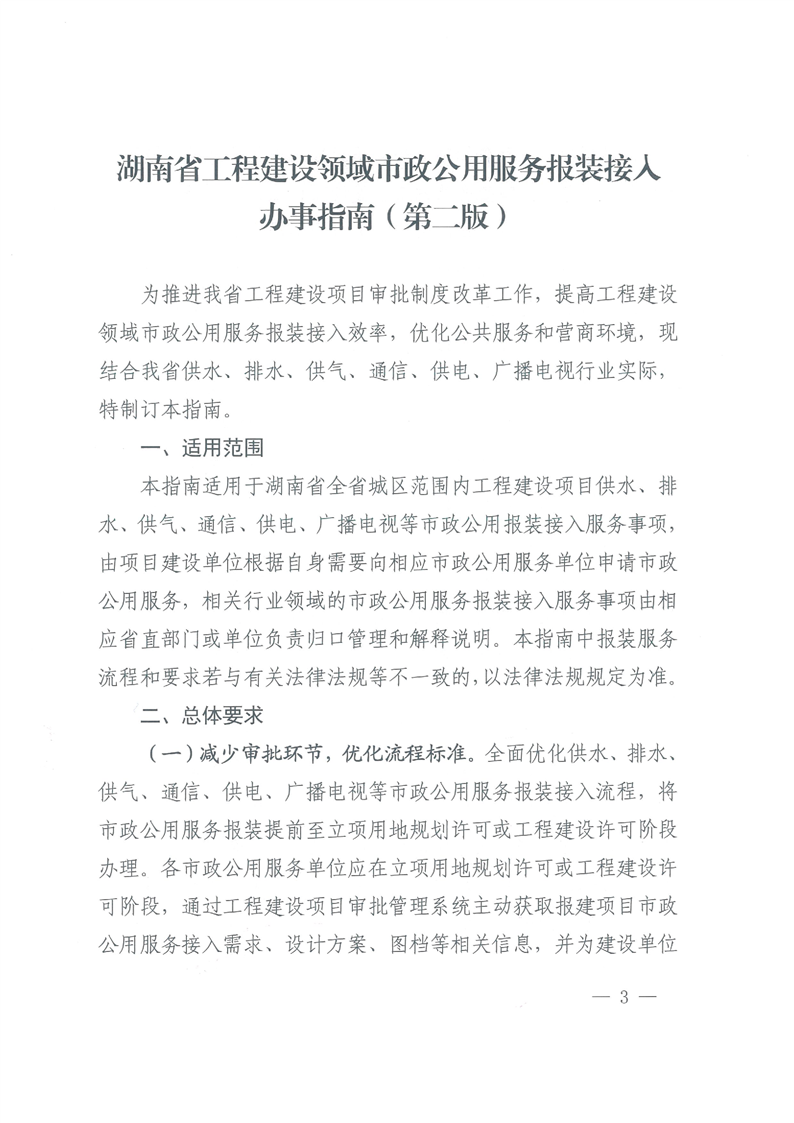 制度改革的实施意见》(国办发〔2019〕11号)、《湖南省人民政府办公厅关于推动工程建设项目审批制度改革的指导意见》(相政办发〔2018〕76号)、《湖南省人民政府办公厅关于印发<工程建设项目审批制度深化改革实施方案>的通知》(湘政办发〔2019]24号)、《湖南省人民政府办公厅关于印发<湖南省优化营商环境攻坚行动方案>的通知》(湘政办发〔2021〕18号)、《湖南省工程建设项目审批制度改革工作领导小组办公室关于印发<湖南省工程建设项目审批制度改革2.0版重点任务>的通知》(湘工改办〔2021)4号)要求,进一步简化优化供水、排水、供气、通信、供电、广播电视等市政公用服务报装接入办理流程,规范服务标准,我们制定了《湖南省工程建设领域市政公用服务报装接入办事指南(第二版)》。现印发给你们,请遵照执行。本通知自2022年4月1日起实施。