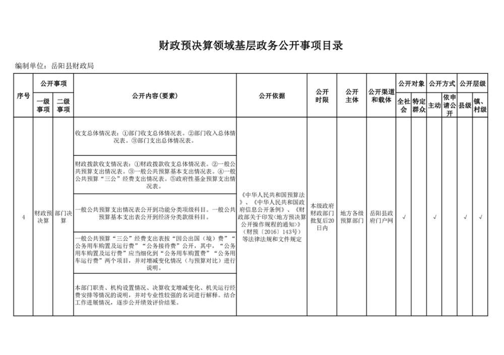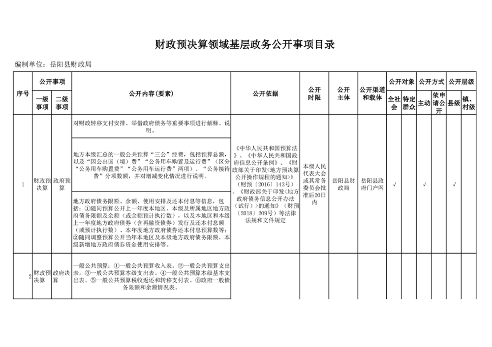 2024年岳阳县财政预决算领域基层政务公开标准目录