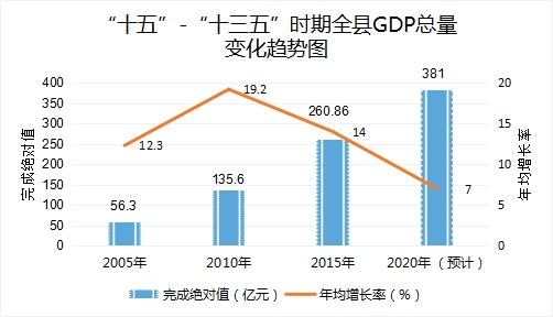 经济平稳较快增长。到2020年底,全县预计完成地区生产总值381亿元,比2015年(下同)增加121亿元,年均增长7%;一般公共预算地方收入7.15亿元,增长49%,年均增长8.3%;固定资产投资年均增长11.7%;社会消费品零售总额124亿元,增长46%,年均增长6.5%;城镇居民人均可支配收入32517元,增长46.5%,年均增长7.7%;农村居民人均可支配收入19348元,增长51.8%,年均增长8.7%。五年来,争取国家重点投入项目563个,到位资金123.9亿元;争取融资项目16个,落实资金49.6亿元;引进招商项目超过200个,到位资金突破400亿元。财纳福诺、渔美康、盛路宸博、慧璟科技等投资过10亿元项目密集进驻我县,是历史上项目建设力度最大的时期。
