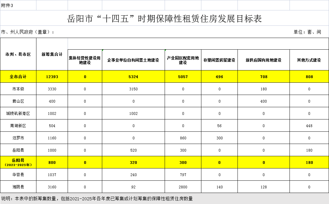 岳阳市“十四五”时期保障性租赁住房发展目标表