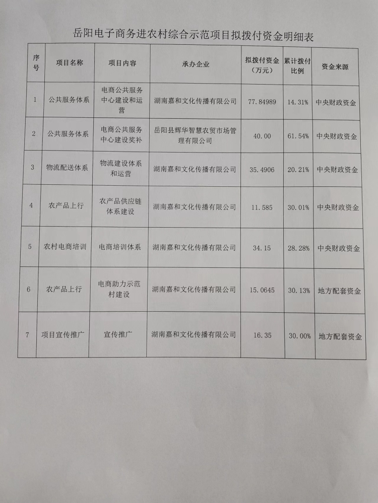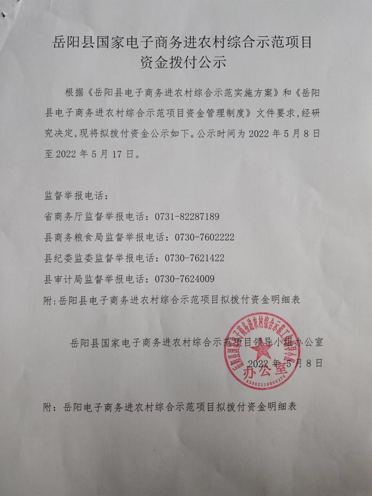 岳阳县国家电子商务进农村综合示范项目资金拨付公示