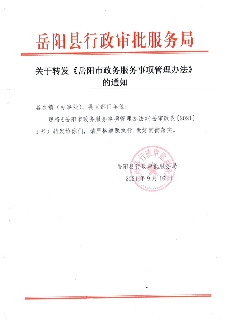 岳阳县行政审批服务局关于转发《岳阳市政务服务事项管理办法》的通知