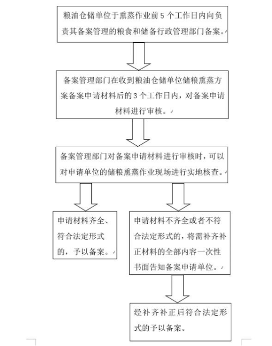 1.《粮油仓储管理办法》(国家发展和改革委员会令2009年第5号)第二十五条:“进行熏蒸作业的,应当制订熏蒸方案,并报当地粮食行政管理部门备案。熏蒸作业中,粮油仓储单位应当在作业场地周围设立警示牌和警戒线,禁止无关人员进入熏蒸作业区。” 2.《湖南省粮油仓储单位储粮熏蒸方案备案办法》(湘粮储〔2017〕98号)全文。