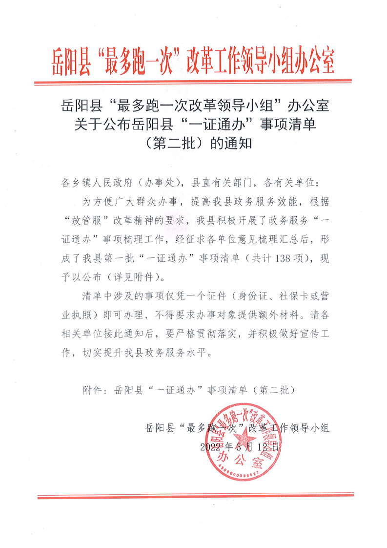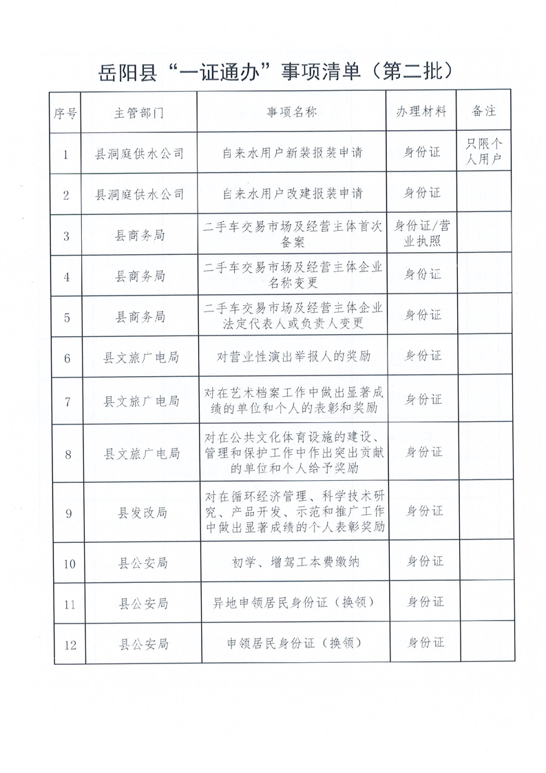 岳阳县“最多跑一次改革领导小组”办公室关于公布岳阳县“一证通办”事项清单(第二批)的通知