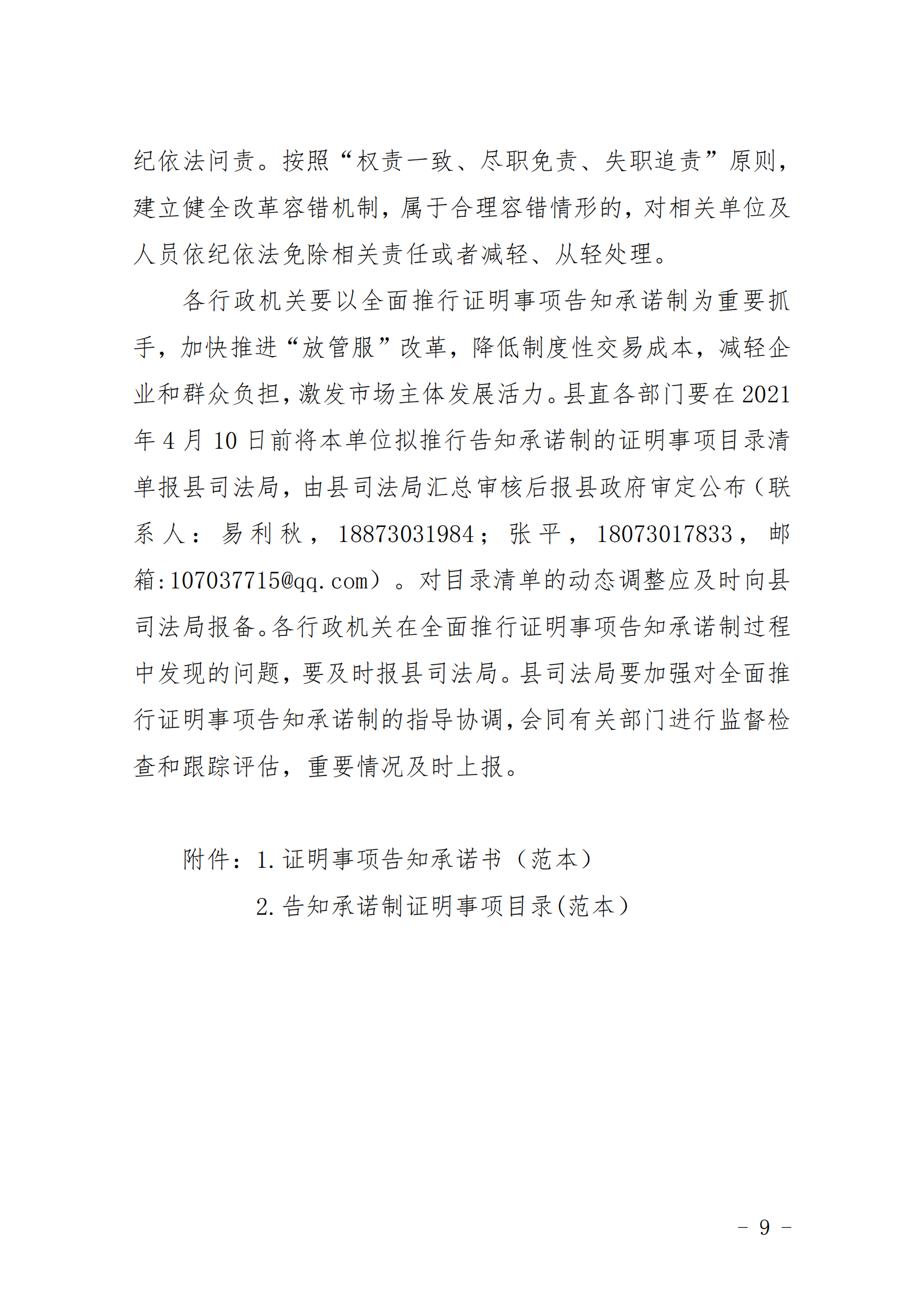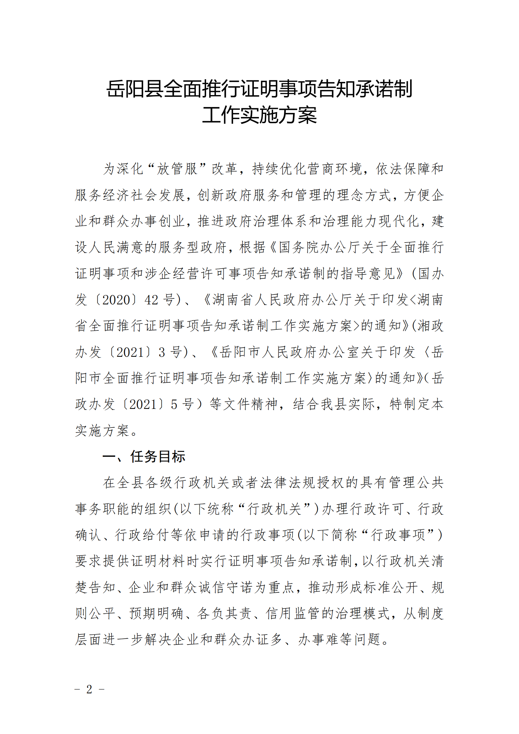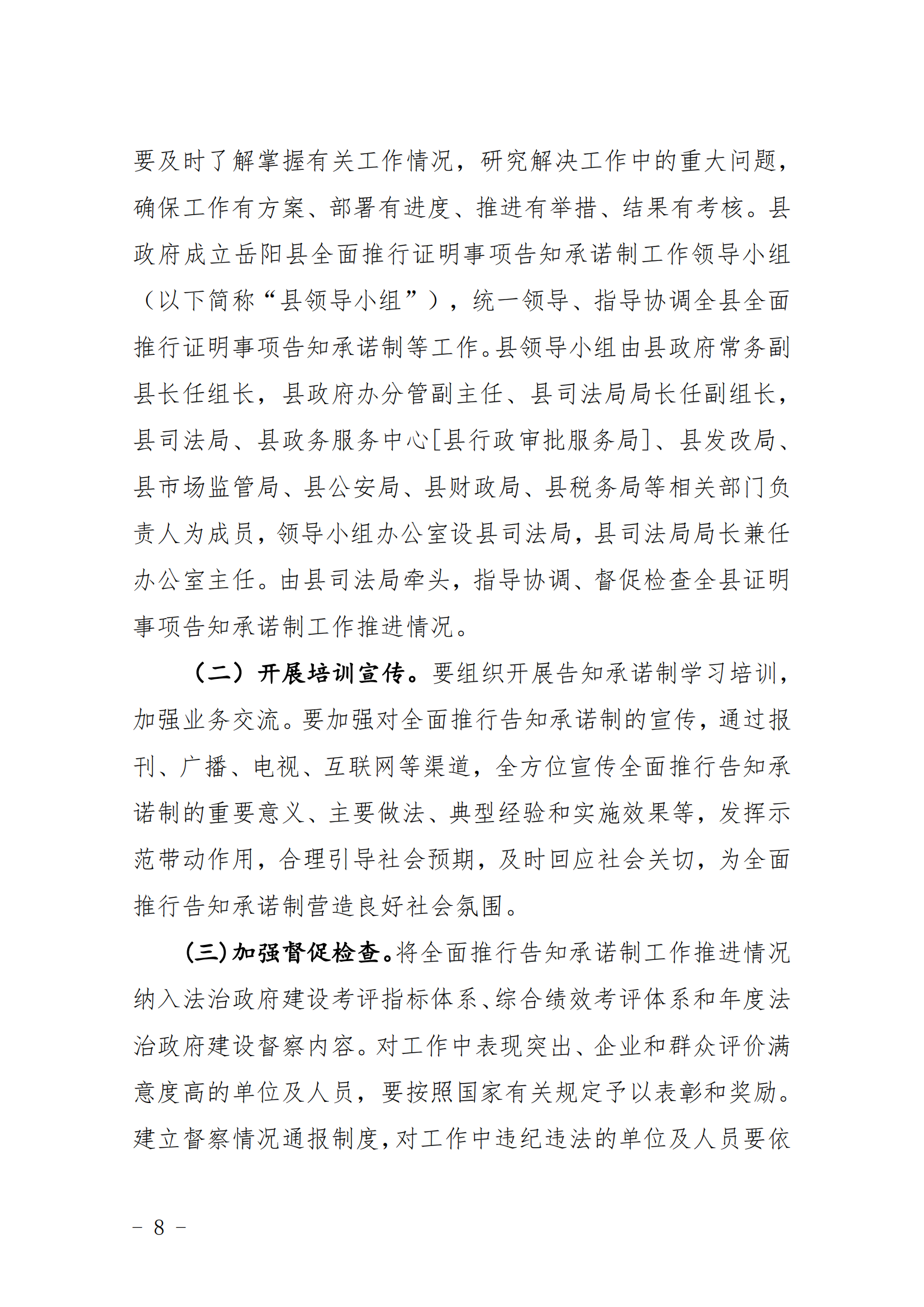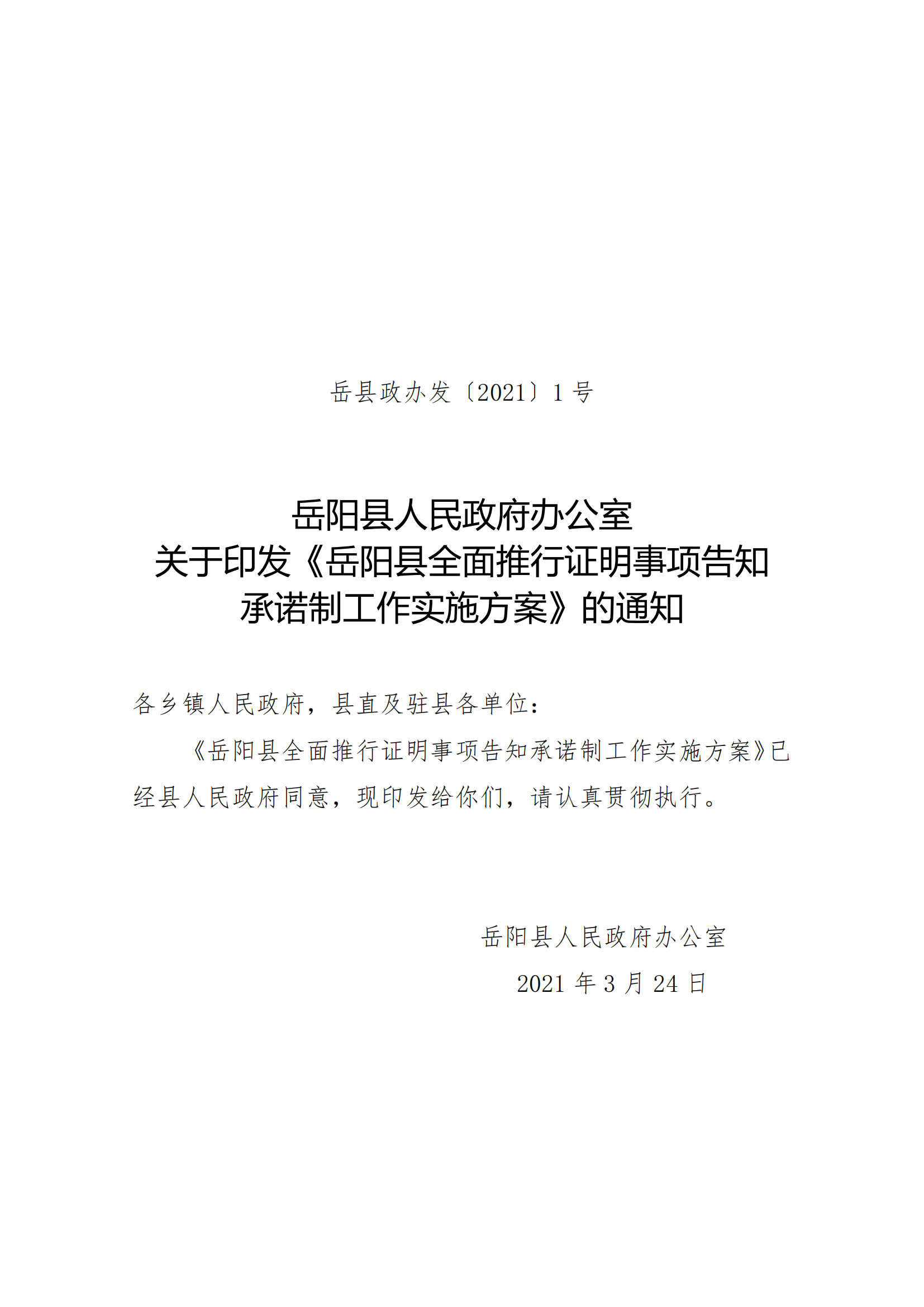 岳阳县人民政府办公室 关于印发《岳阳县全面推行证明事项告知 承诺制工作实施方案》的通知
