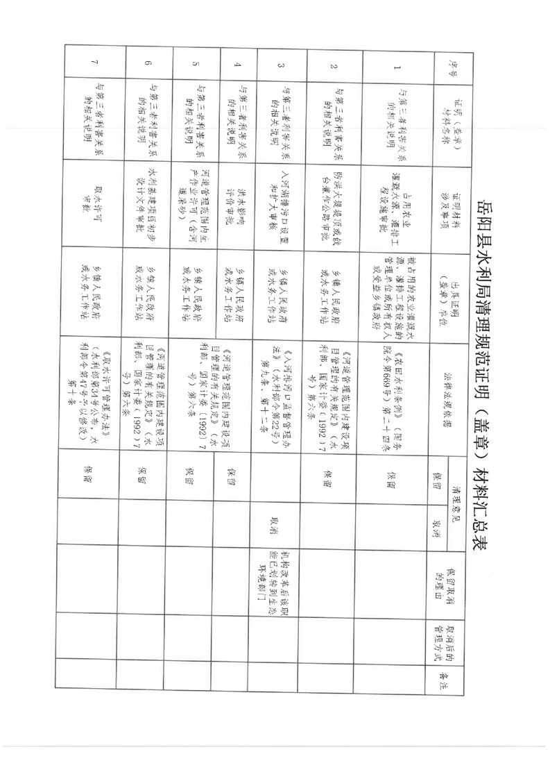 岳阳县水利局清理规范证明(盖章)材料汇总表
