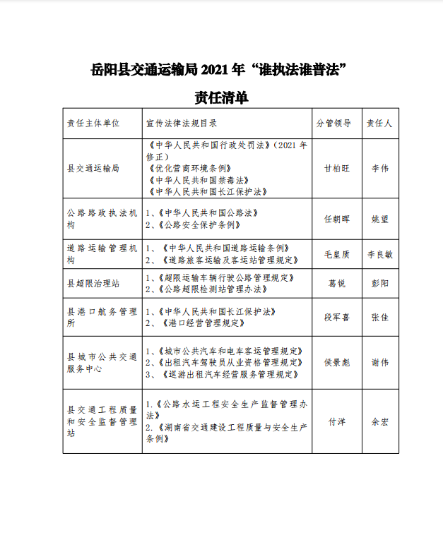 岳阳县交通运输局2021年“谁执法谁普法”责任清单