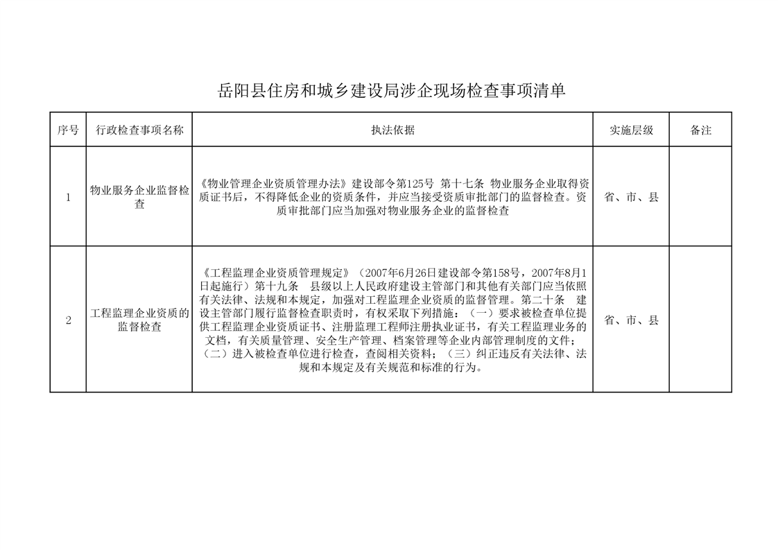岳阳县住房和城乡建设局涉企现场检查事项清单