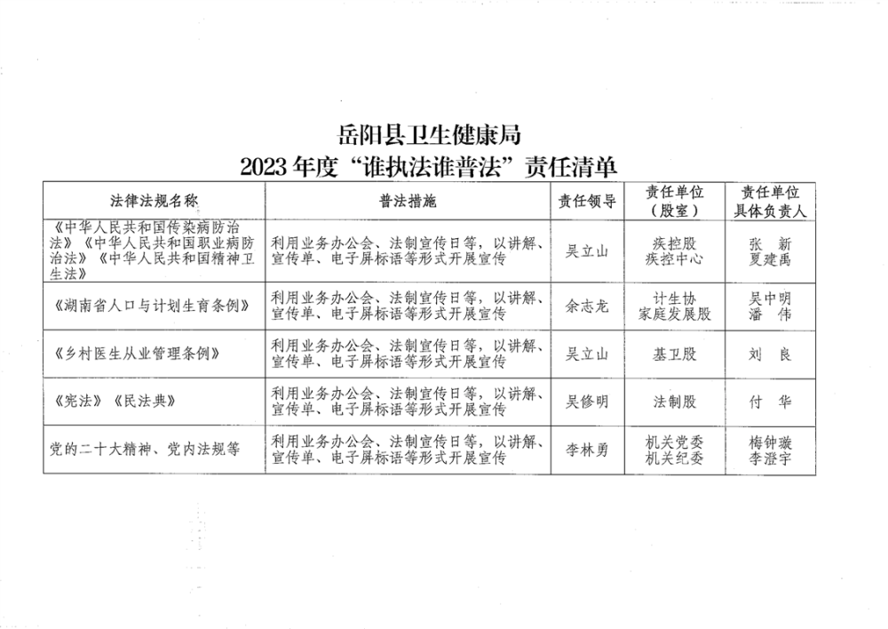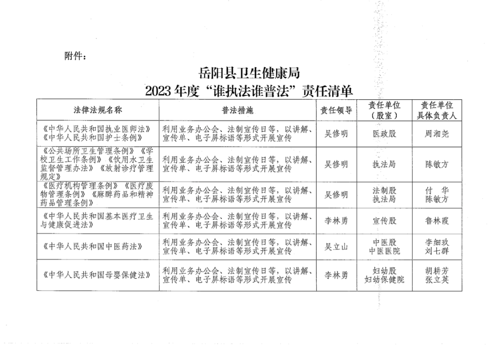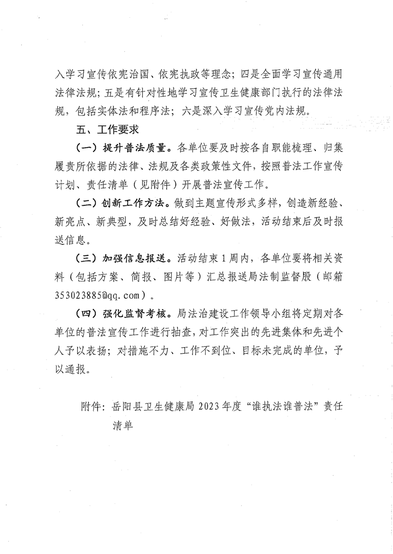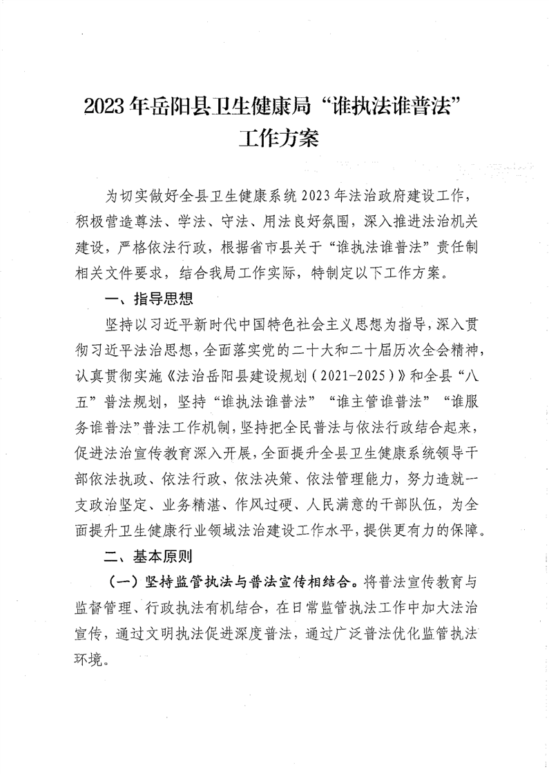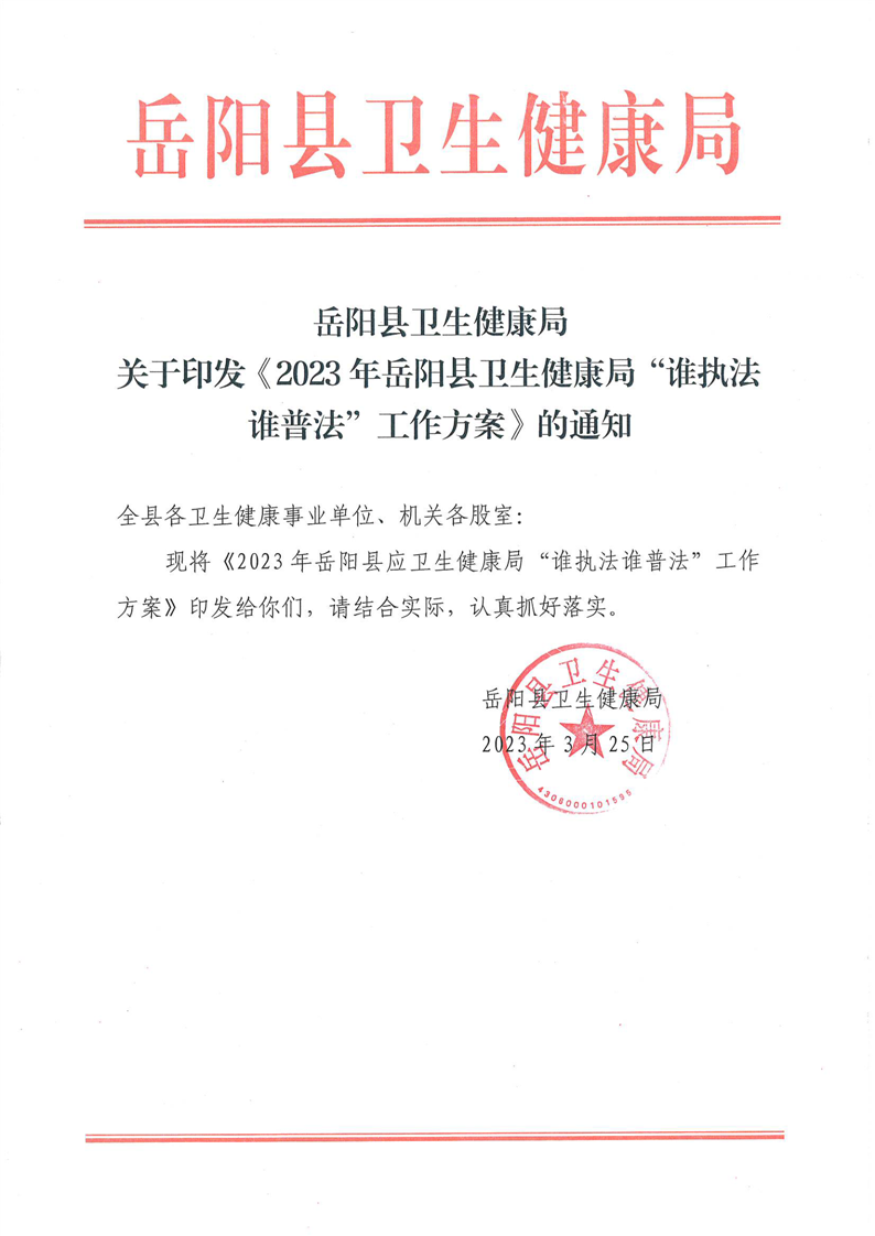 岳阳县卫生健康局关于印发《2023年岳阳县卫生健康局“谁执法谁普法”工作方案》的通知