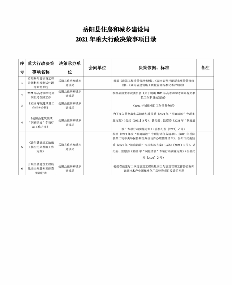 岳阳县住房和城乡建设局2021年重大行政决策事项