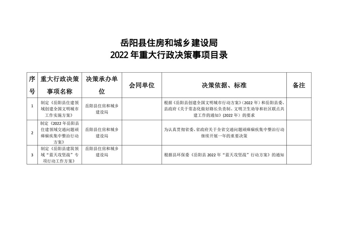 岳阳县住房和城乡建设局2022年重大行政决策事项