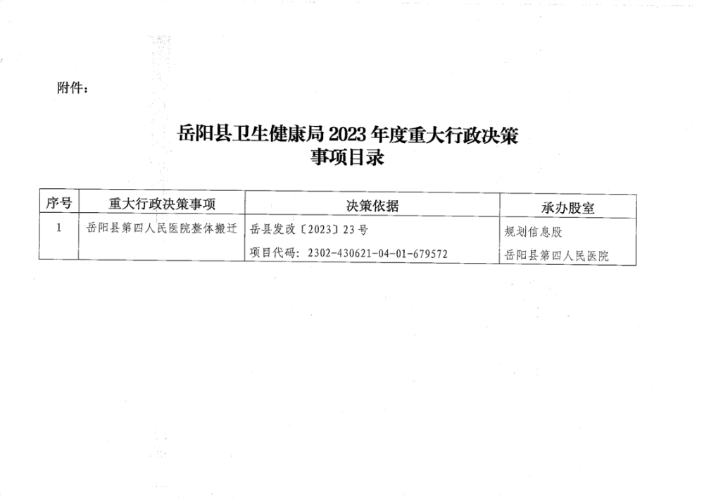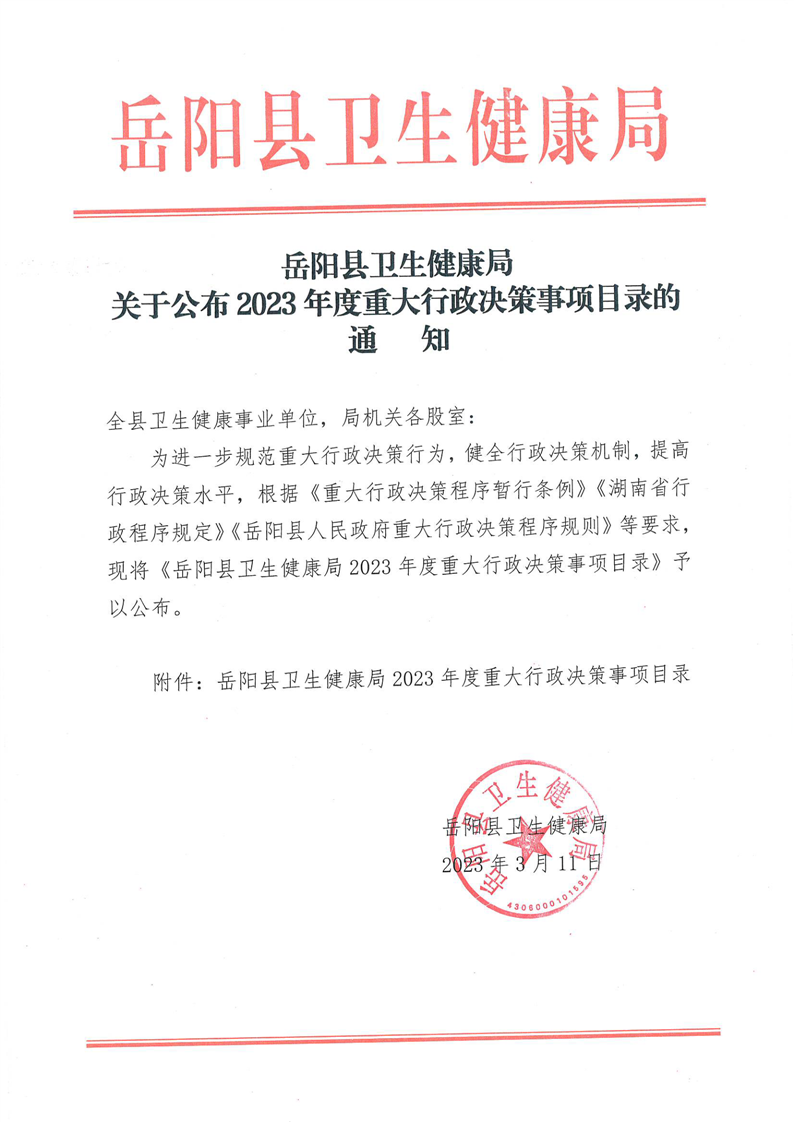 岳阳县卫生健康局关于公布2023年度重大行政决策事项目录的通知
