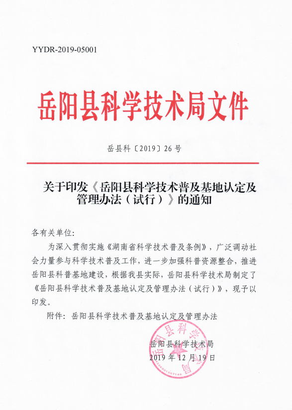 第九条 经认定的县科普基地,由县科技行政管理部门颁发《岳阳县科学技术普及基地认定证书》,授予“岳阳县科学技术普及基地”牌匾。