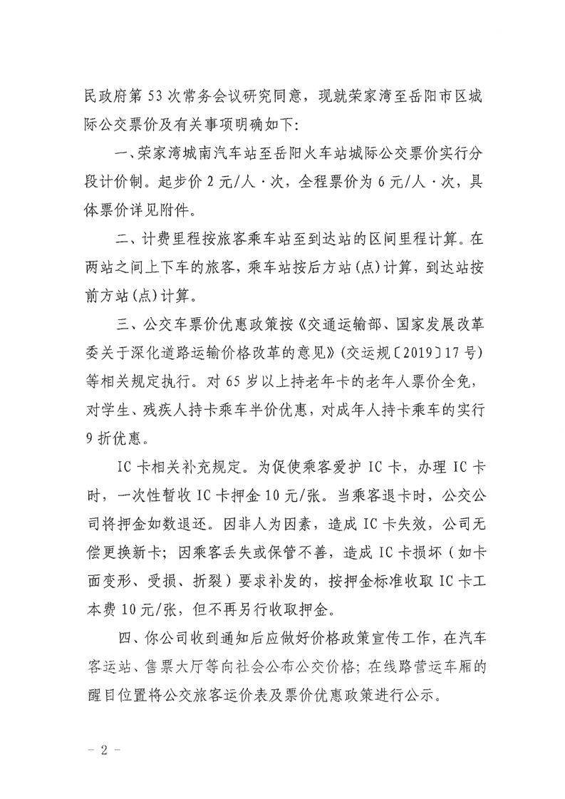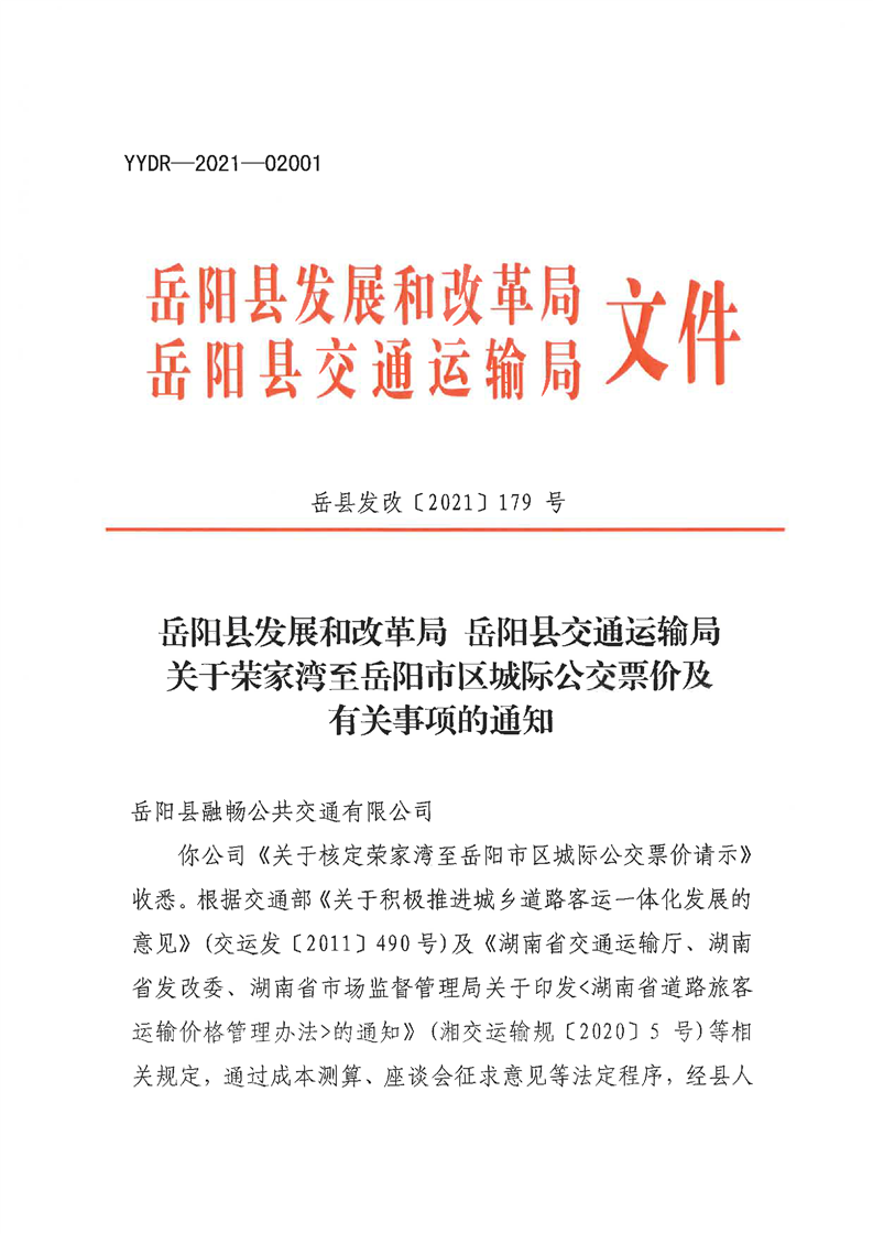 岳阳县发展和改革局 岳阳县交通运输局《关于荣家湾至岳阳市区城际公交票价及有关事项的通知》