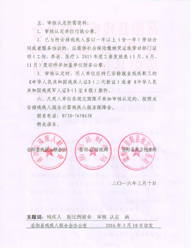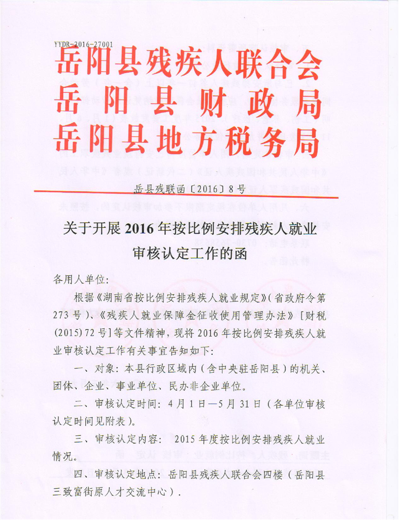 关于开展2016年按比例安排残疾人就业审核认定工作的函