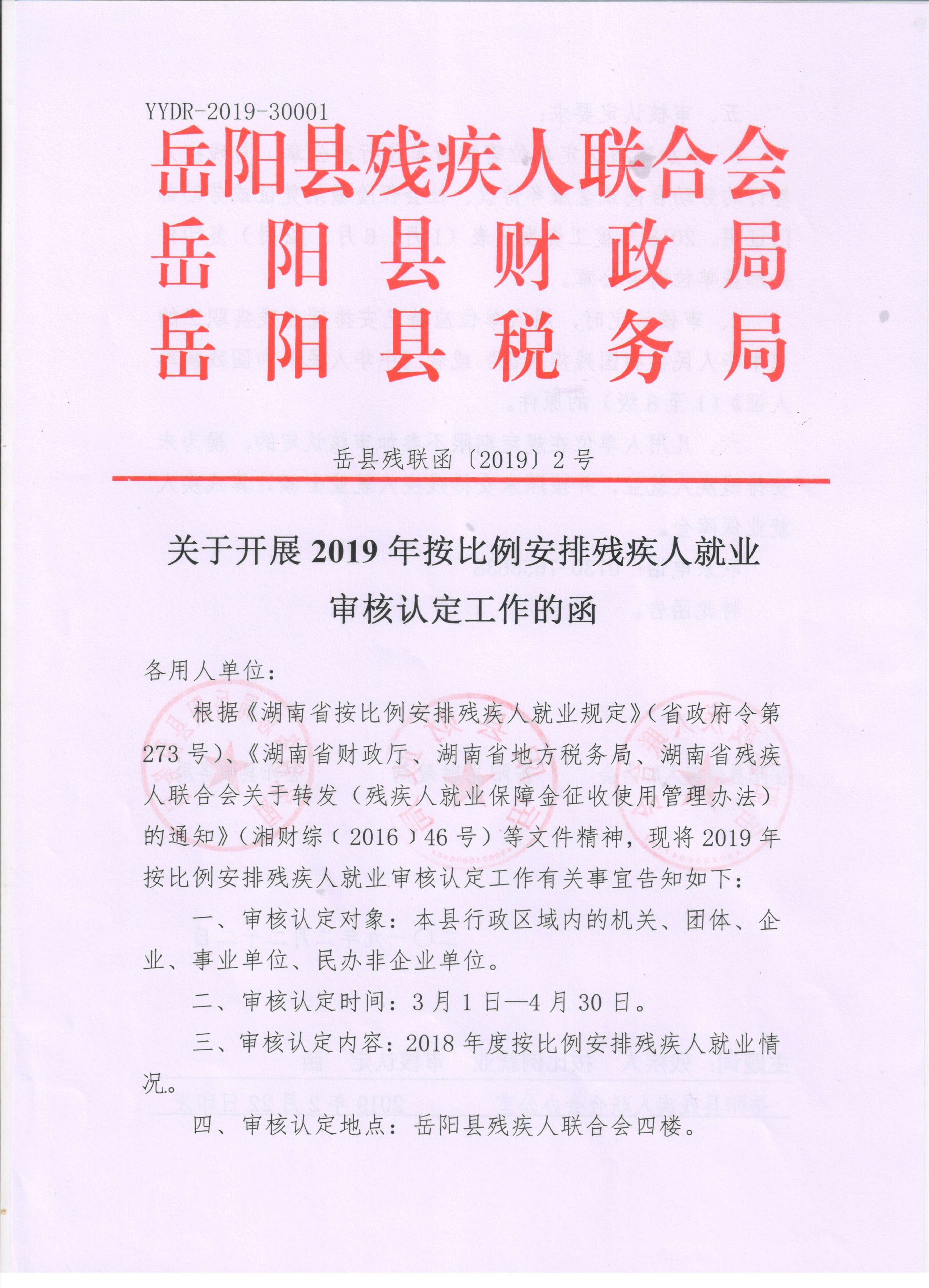 关于开展2019年按比例安排残疾人就业审核认定工作的函