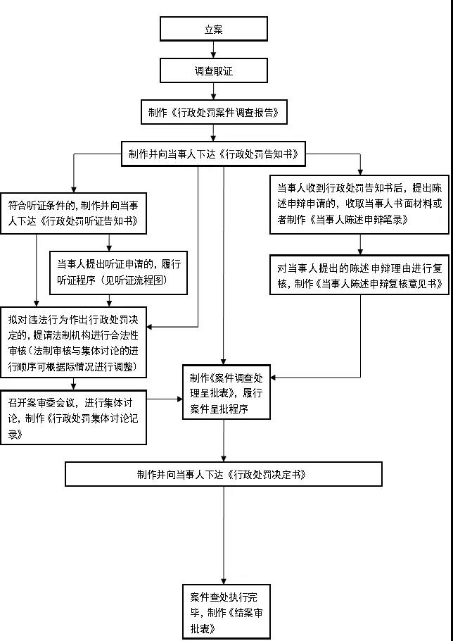 立案——调查取证——必要时进行听证——作出处罚决定——执行。详见附件2行政处罚流程。