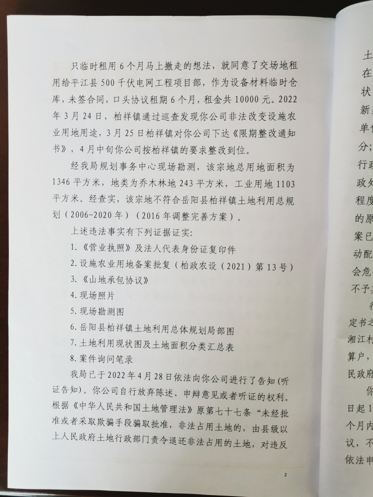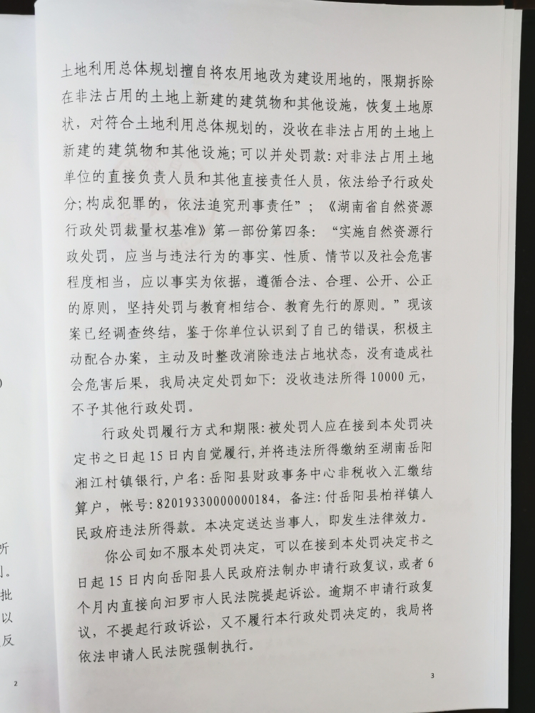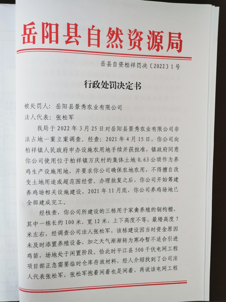 柏祥镇岳阳县景秀农业有限公司非法改变设施农业用地用途案行政处罚决定书