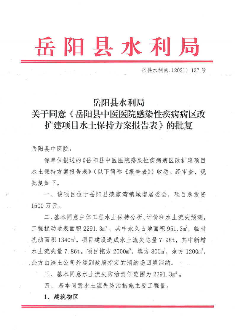 岳阳县水利局关于同意《岳阳县中医医院感染性疾病病区改扩建项目水土保持方案报告表》的批复