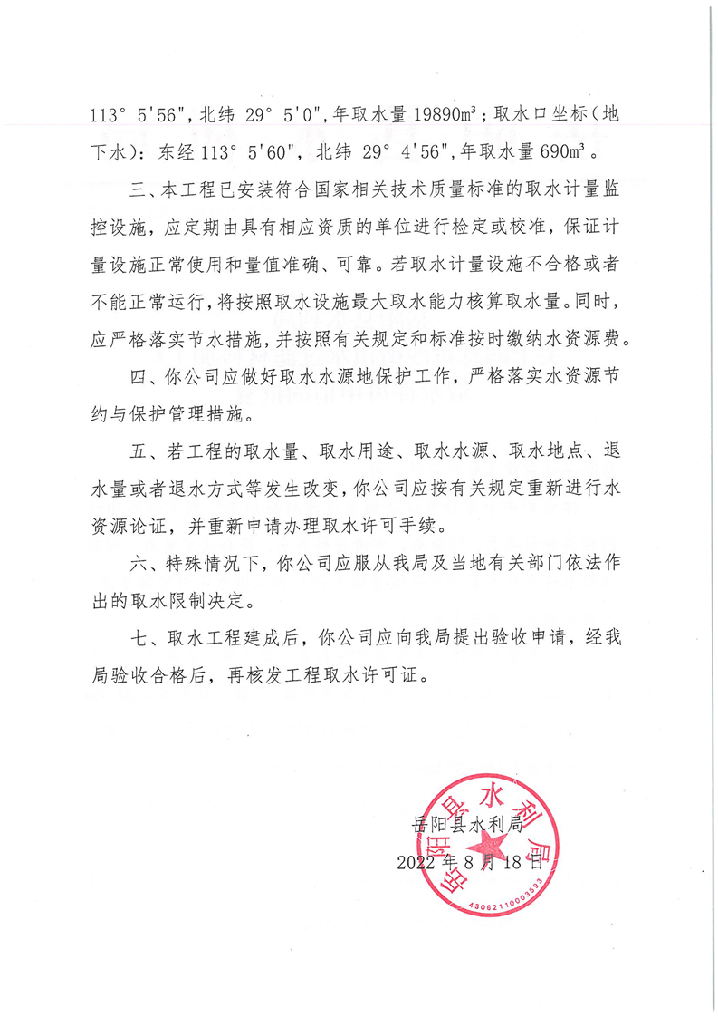 岳阳县水利局关于同意黄沙街镇水过滤材料加工厂取水许可申请的批复
