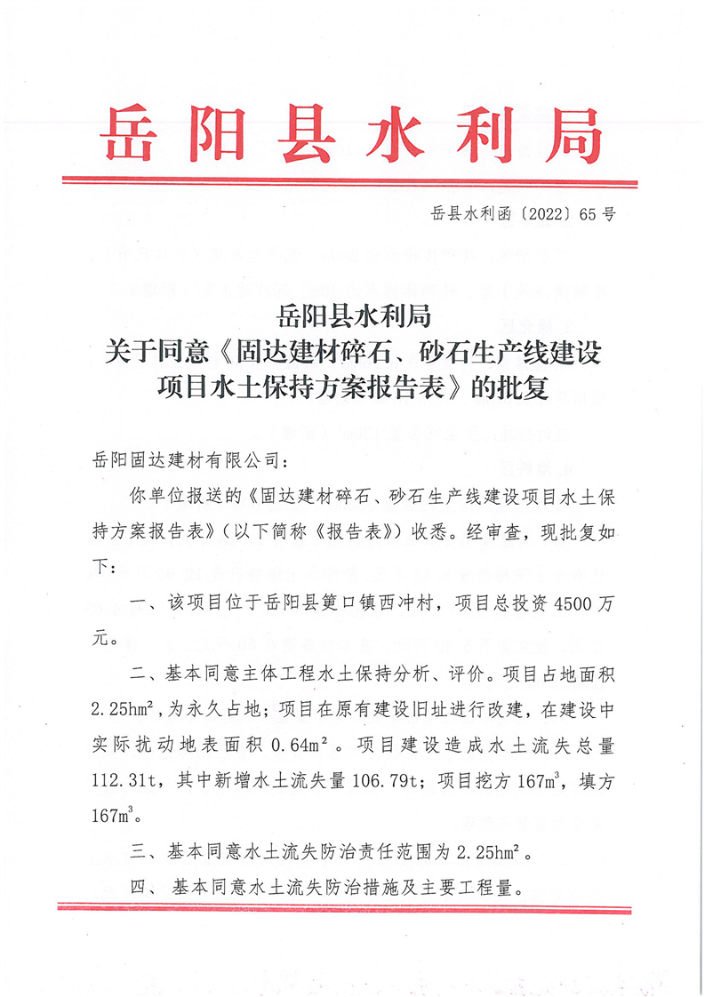 岳阳县水利局关于同意《固达建材碎石、砂石生产线建设项目水土保持方案报告表》的批复