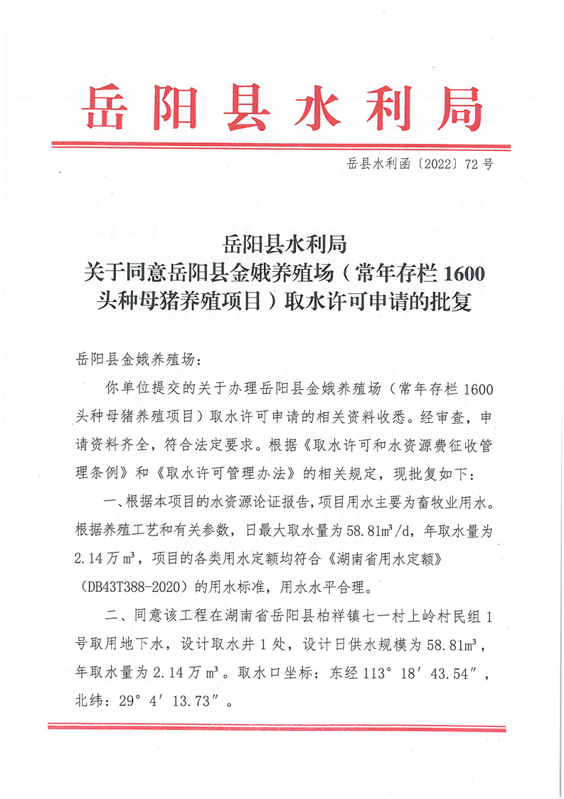 岳阳县水利局关于同意岳阳县金娥养殖场(常年存栏1600头种母猪养殖项目)取水许可申请的批复