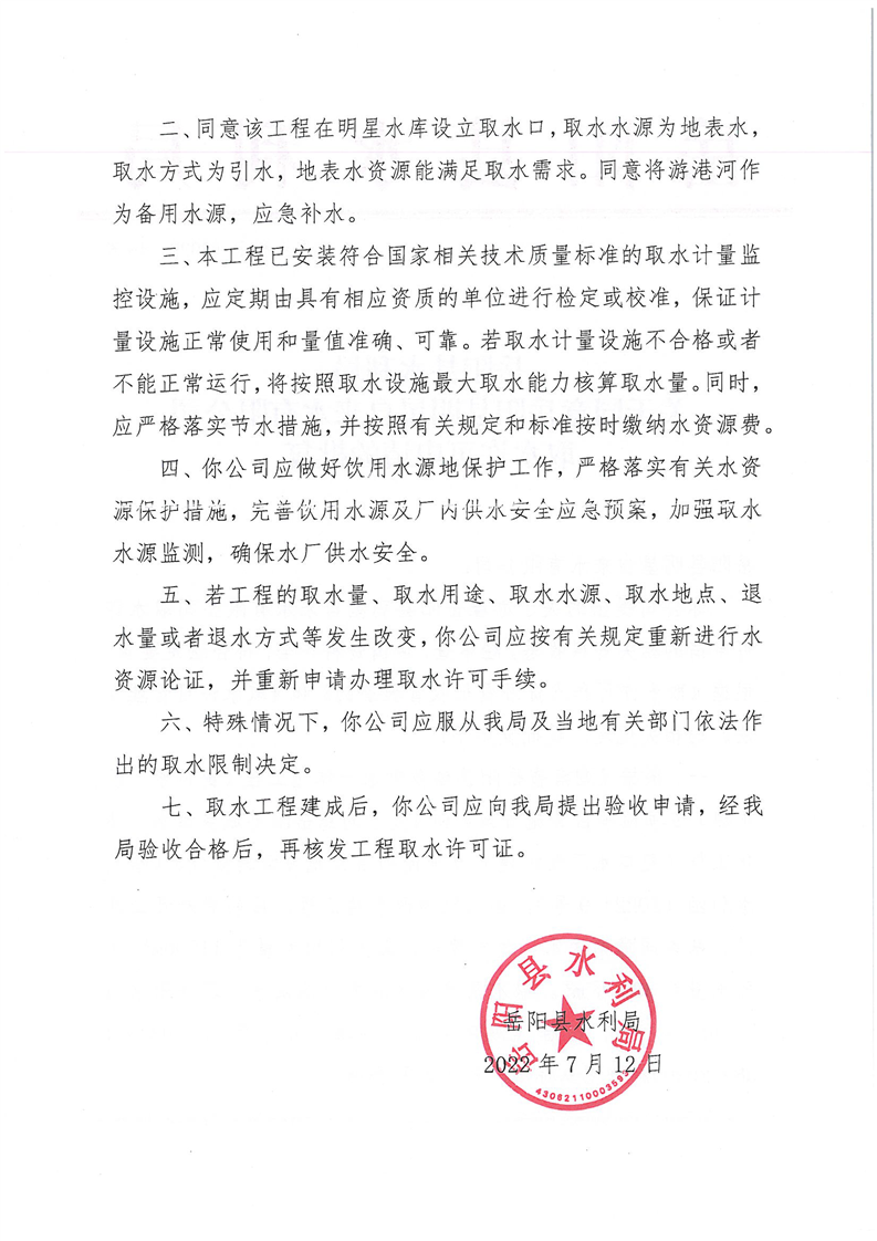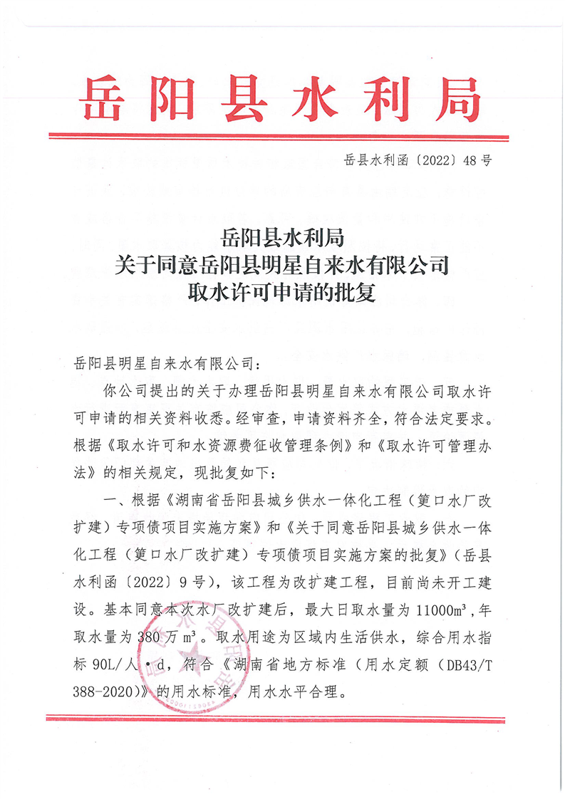 岳阳县水利局关于同意岳阳县明星自来水有限公司取水许可申请的批复
