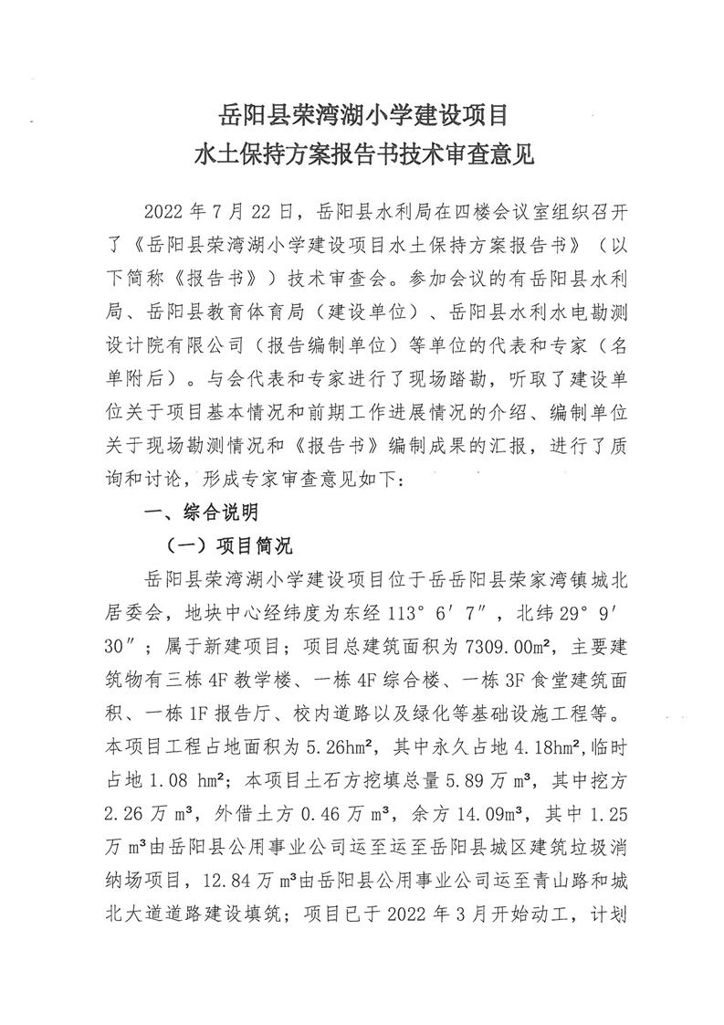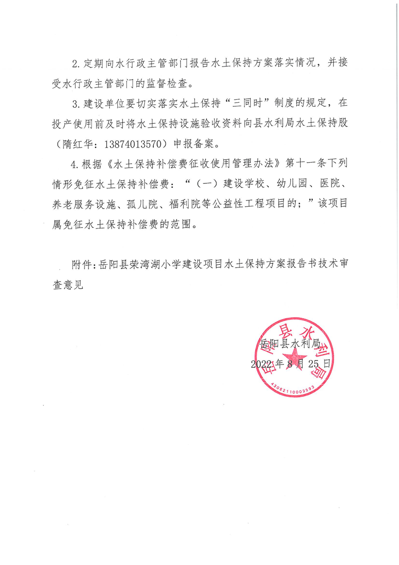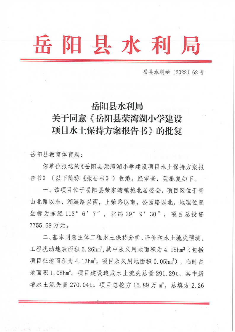岳阳县水利局关于同意《岳阳县荣湾湖小学建设项目水土保持方案报告书》的批复