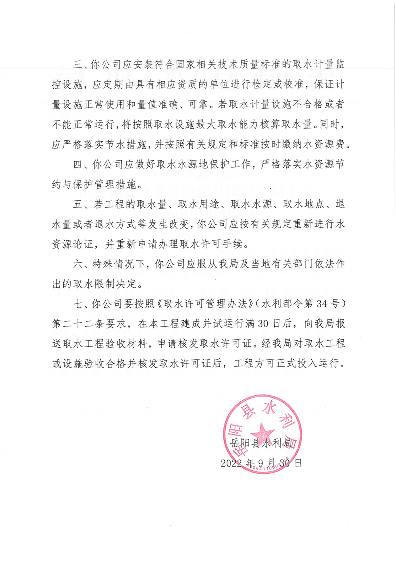 岳阳县水利局关于同意岳阳县双田自来水有限公司取水许可申请的批复