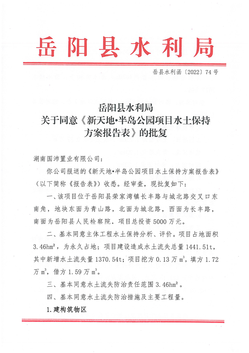 岳阳县水利局关于同意《新天地•半岛公园项目水土保持方案报告表》的批复